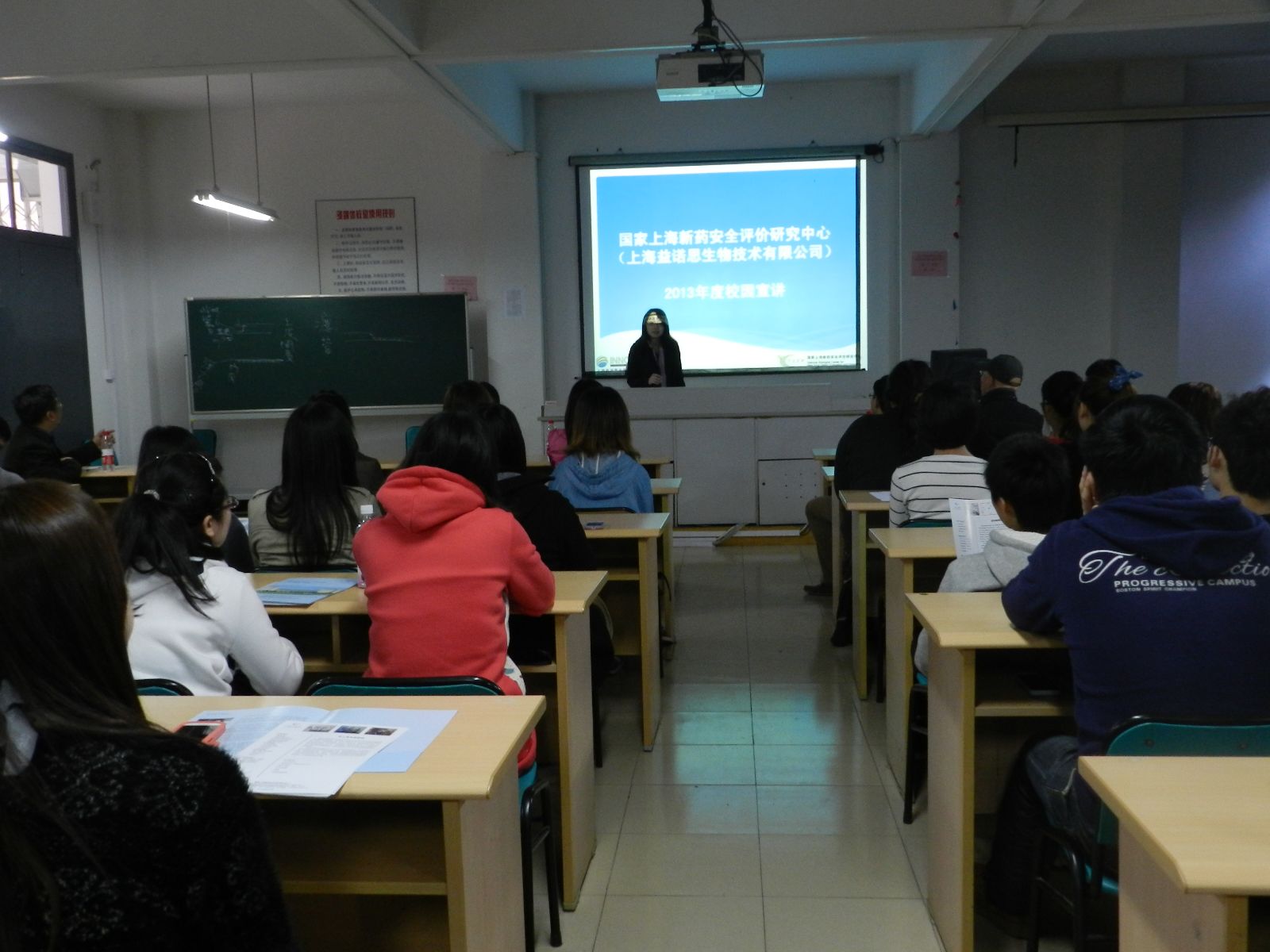 安评中心人力资源部主管刘老师介绍并讲解了公司与我院合作的历史,并表扬我校已毕业的学子在工作中的扎实、勤奋和认真表现,已有不少的毕业生取得了升职的机会。随后,介绍了安评中心的背景、发展历程、性质和宗旨、研究的项目以及缜密的职工培训体系,据悉,国家上海新药安全评价研究中心是五个国家级GLP中心之一,并第一批通过了OECD成员国认证。