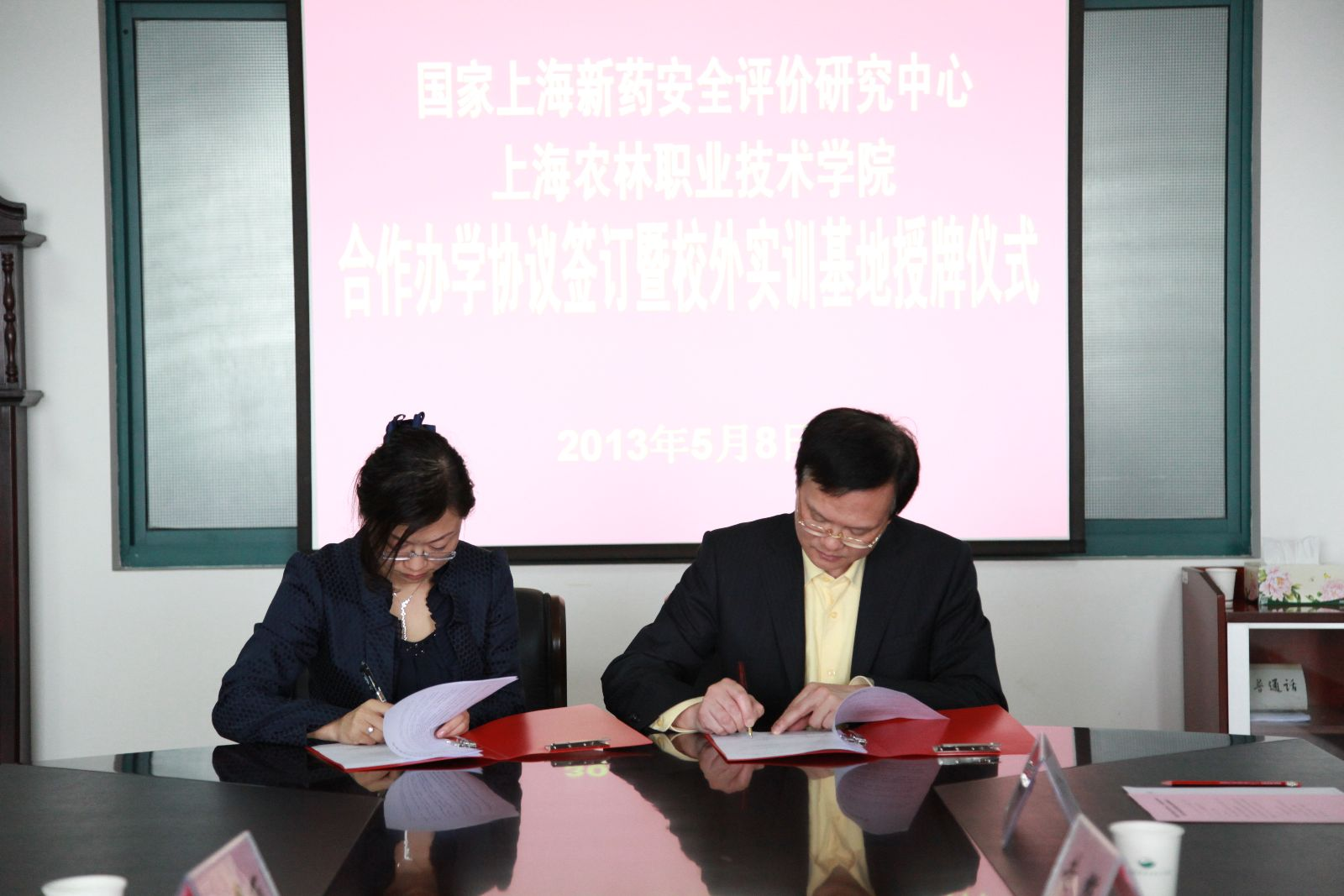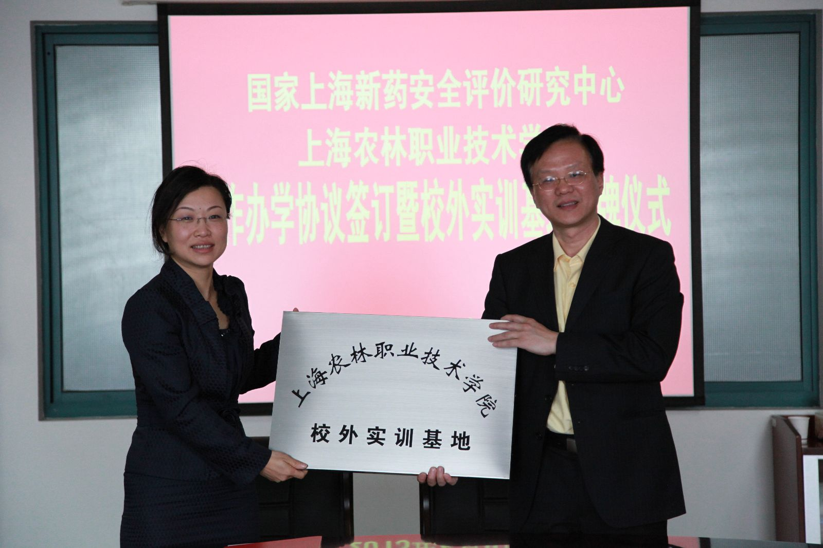 魏华院长、常艳副主任分别代表双方共同签署合作协议并由魏华院长代表学院授予国家上海新药安全评价研究中心校外实训基地牌匾。