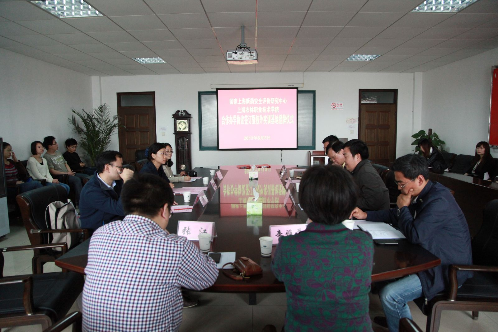 5月8日上午,学院与国家上海新药安全评价研究中心(简称“新药安评中心”)签订合作办学协议暨校外实训基地授牌仪式在学院综合楼1002室举行。学院院长魏华、副院长谢锦平、市农校副校长黄辉,国家上海新药安全评价研究中心副主任常艳、办公室主任刘戴丽、动物管理部经理潘学营出席,学院教导处、动物科学系负责人及该系有意向报名“安评班”16名学生参加仪式。会议由校企合作办主任辛雅芬主持。