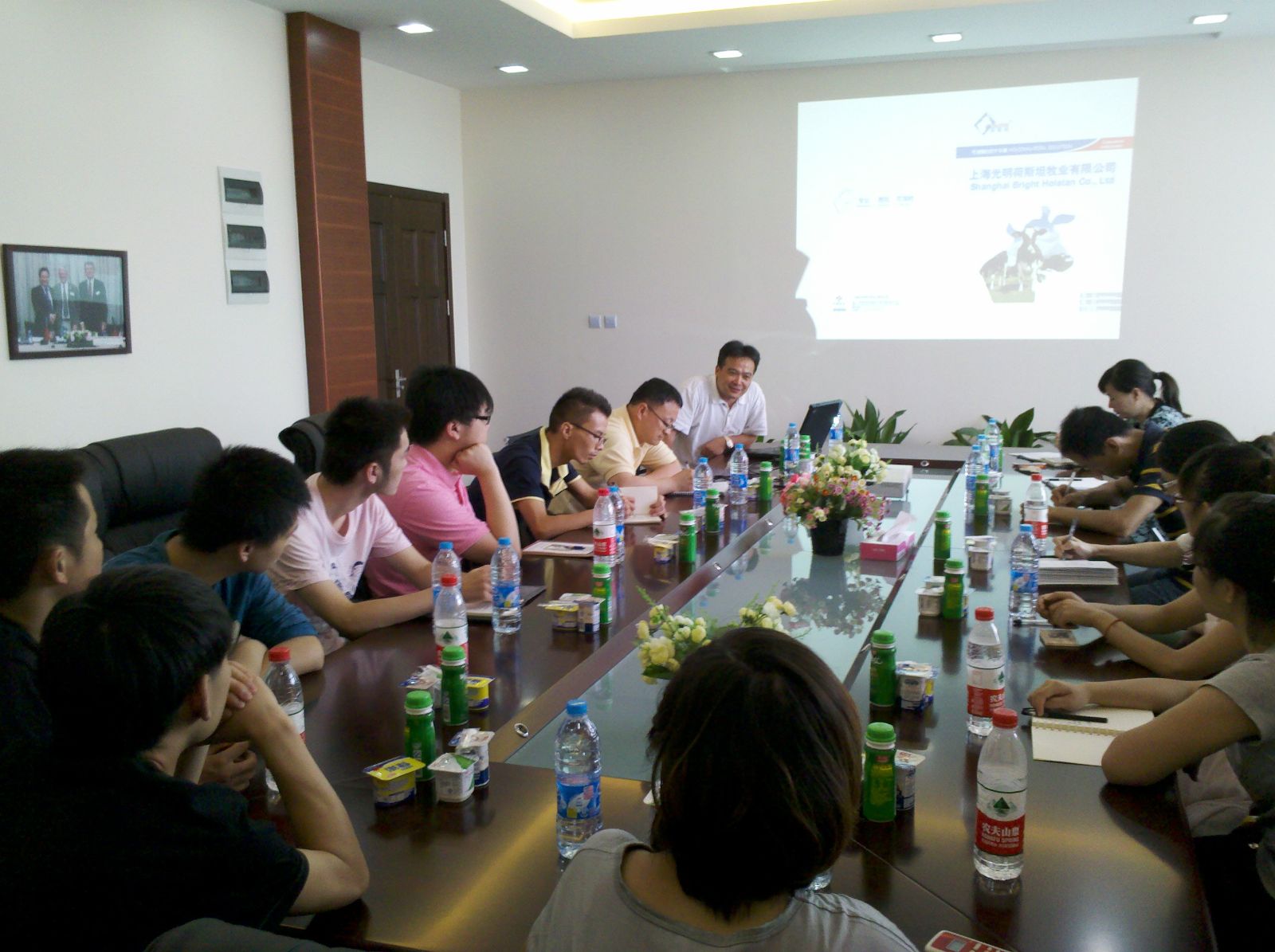 为进一步加强校企联合,实现课堂教学与企业生产的无缝连接,提高教学质量。7月4日下午,动科系光明荷斯坦班的10位准员工在系党支部书记杜波、动科教研室主任滑志民等老师的带领下前往光明乳业上海总公司进行企业学习调研,并就该班学生的学习及实习计划等问题在公司立会讨论,光明荷斯坦公司总经理黄黎明也参加了此次会议,会议由部门经理乔国奕主持。