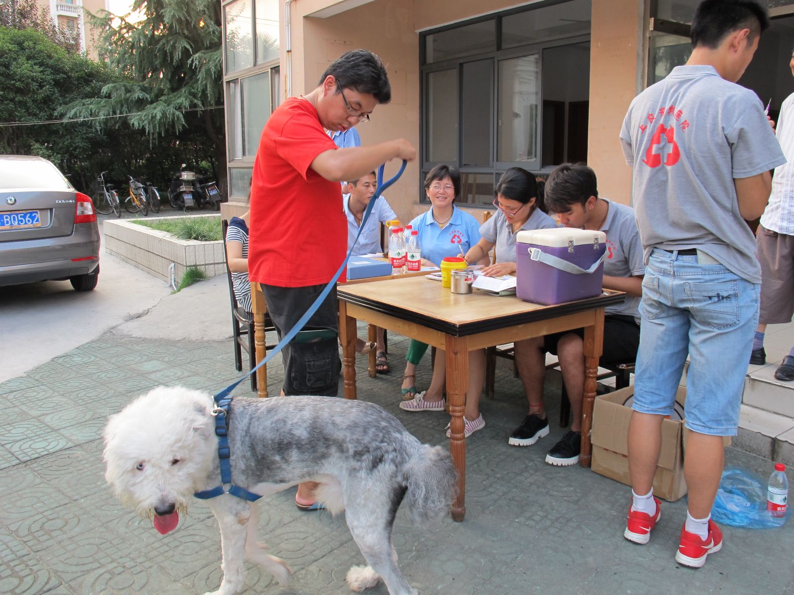 9日下午五点半,培训小组来到了祥和小区,将随队带来的器械、资料等搬下车,在祥老年活动室门口搭起了诊断咨询平台。附近居民看到了,纷纷将自家养的宠物牵来,有办理犬证的、有接种的,也有关于宠物饲养、疾病等问题咨询的。培训小组不顾炎热天气,他们分工明确、默契配合,为前来的居民做了细致、热情的培训服务。培训直到晚上九点才结束返回。本次培训得到了小区居民的肯定和感谢。据统计,当天共为15位居民的宠物犬办理了犬证,并接种了疫苗,并为附近养宠居民提供了养宠方面的咨询服务。