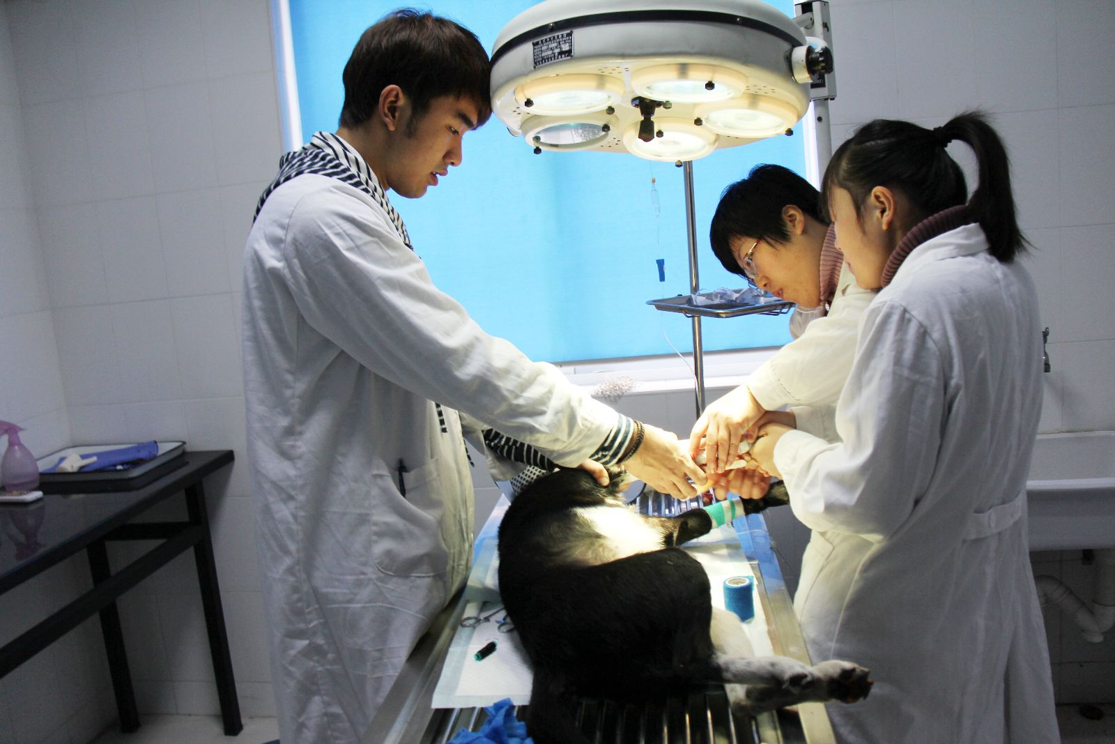 宠物医院里,有老师带着几位学生认真地给小狗检查、注射、挂水。由于社会上的宠物狗情况复杂,病例积累下来已经成为了重要的教学资源。到晚上,医院仍有老师在值班。有时候,为了做好一台手术,宠物医院的老师也经常忙到深夜。而系部老师们为培养学生愿俯首为牛的精神深深影响到了学生。