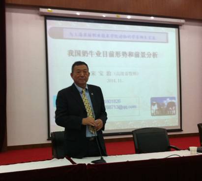 随着奶牛行业的快速发展,行业人才需求量逐年增加,作为上海地区唯一一所培养畜牧兽医行业应用型人才的高校,培养奶牛行业人才更是责无旁贷。为引导和激励更多学生进入奶牛行业,11月6日,动科系邀请农业部国家奶牛科技入户专家组成员、我国奶牛行业著名专家宋宝治高级畜牧师到我校,在综合教学楼205室,与2014级200多名学生交流他的奶牛业人生。行业老前辈与行业潜在的新生力量间的话聊取得了良好效果。