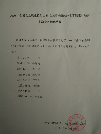 近期动科系组织了2016年全国农业职业技能大赛《鸡新城疫抗体水平测定》项目学生选拔初赛,依据项目竞赛评分标准,经专家现场评定,林涛、张旭贵等八位同学顺利通过上海赛区选拔。