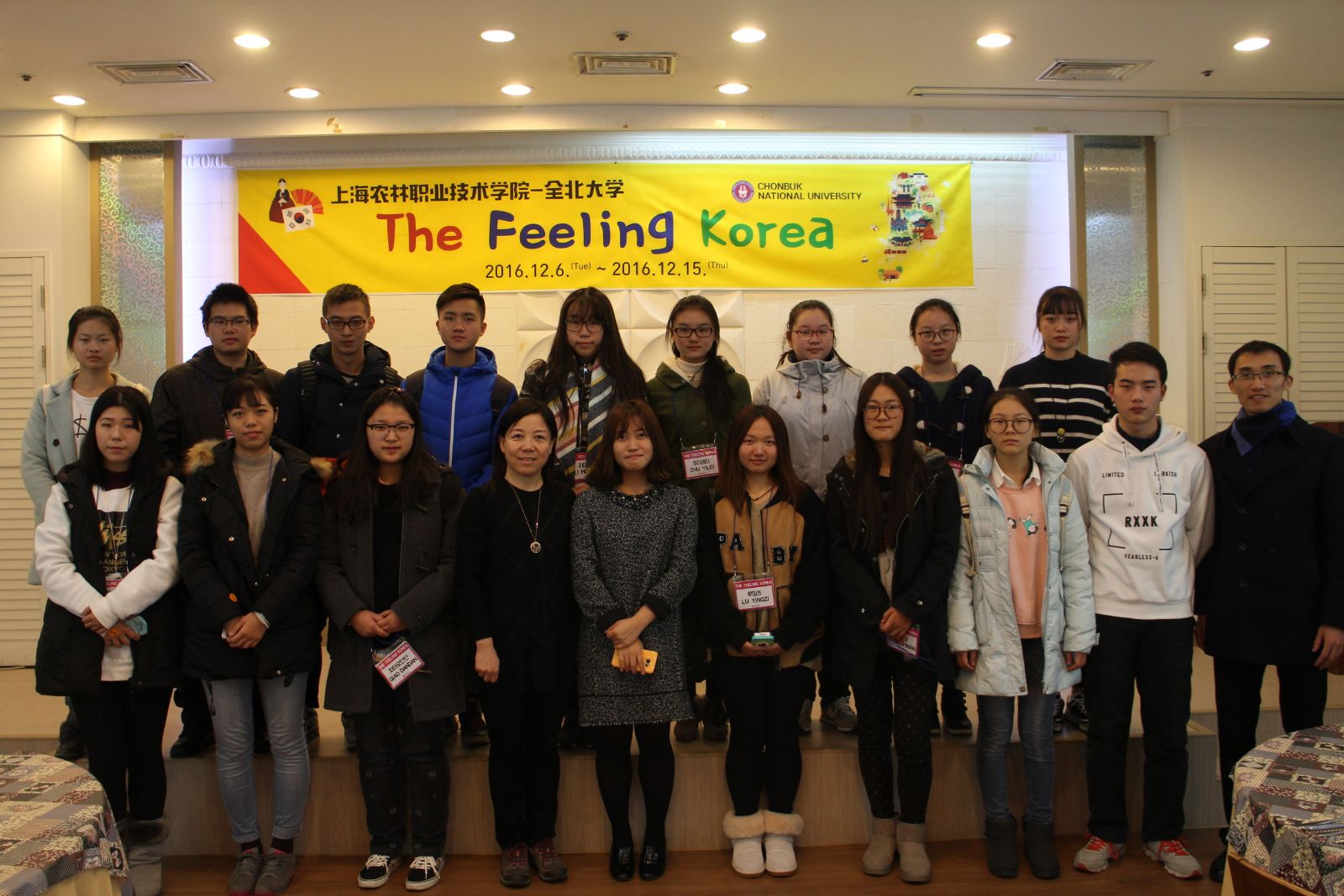 2016年12月6日上午,由动物科学技术系16名动医专业中高贯通学生和2名教师组成的韩国团在团长郑江平的带领下离沪,于当日下午抵达韩国全北国立大学,受到该校国际交流合作部领导和老师的热情接待。在韩方的精心安排下圆满完成了多项学习计划后于12月14日顺利结业,并于15日返沪。