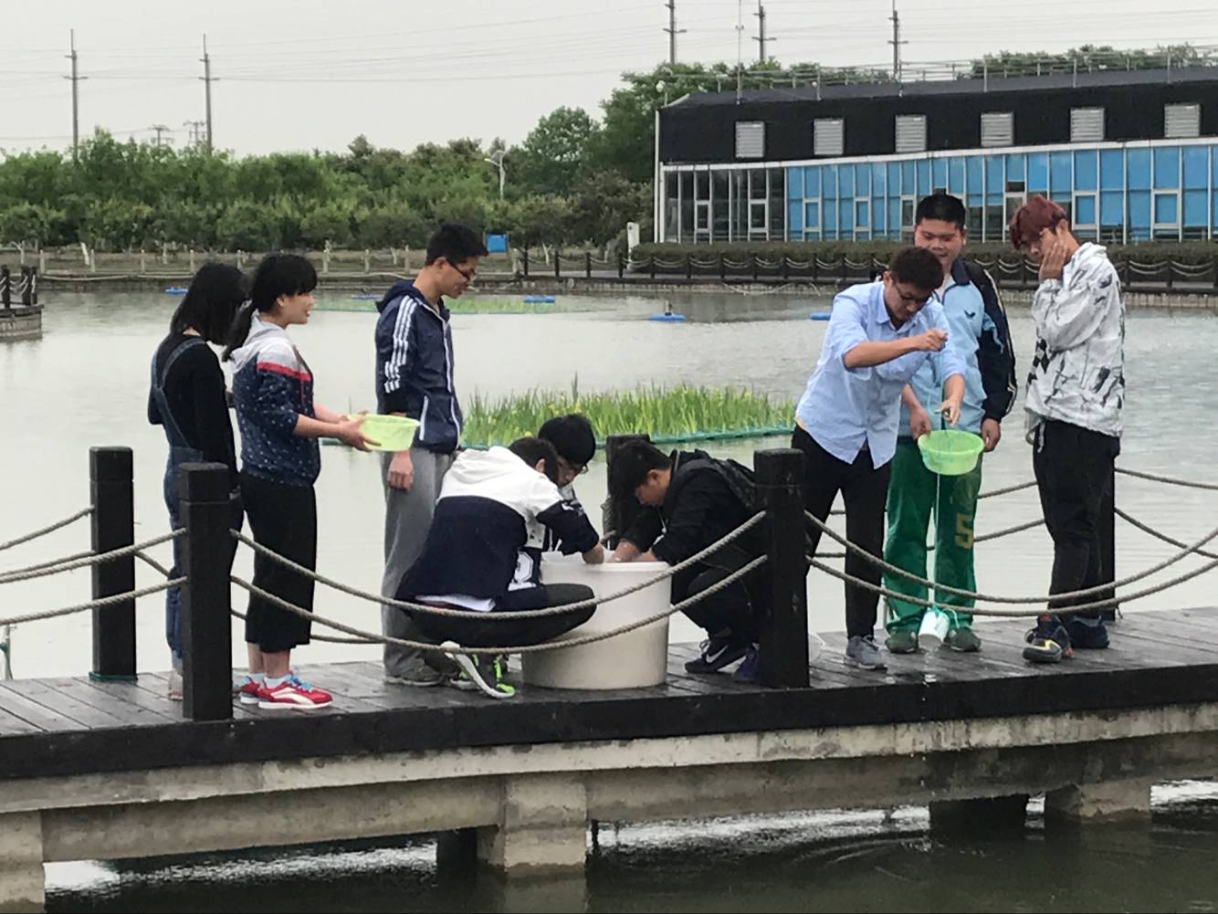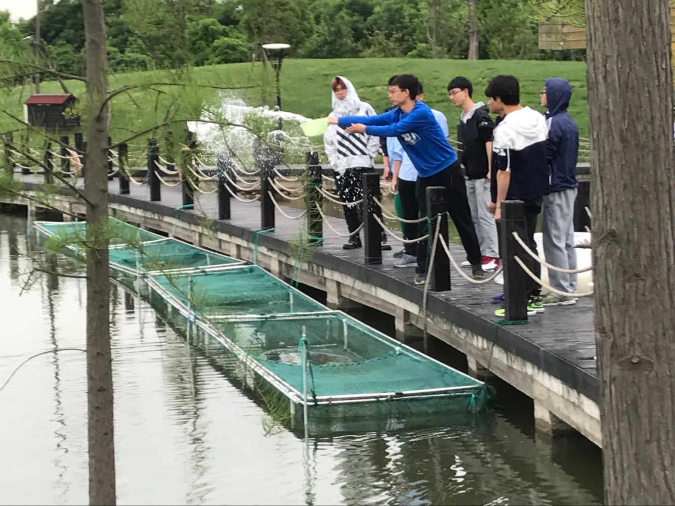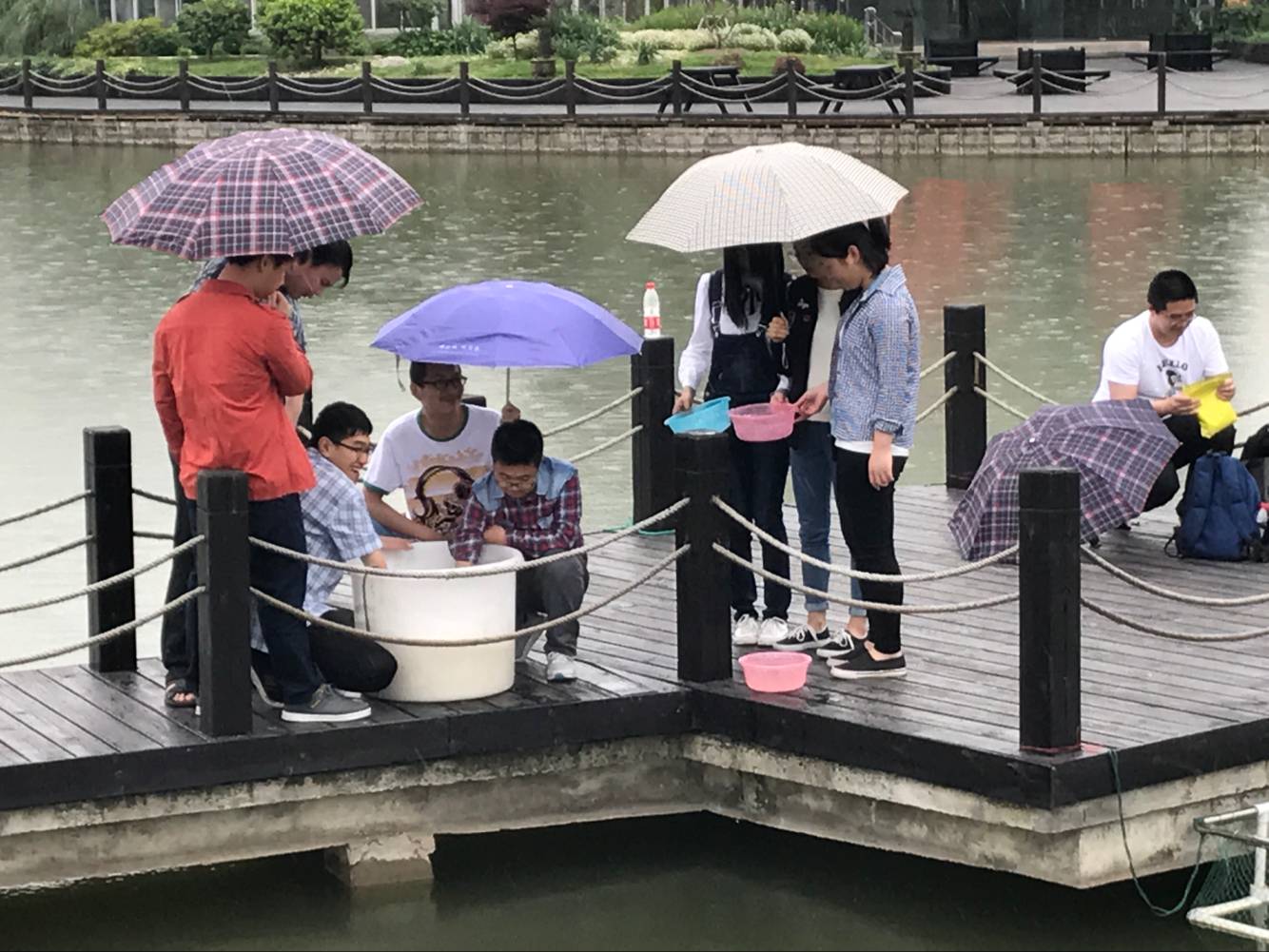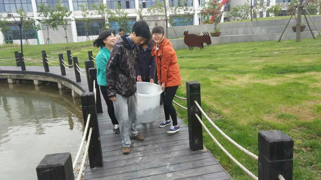 水产151班的课程改革也深深影响了下一个年级的学弟学妹们,一周以后的5月16日,水产161的《动物微生物》课程在基地开展芽孢杆菌的泼洒作业训练。在老师详细讲解了芽孢杆菌的形态、功能、使用方法后,大家分组开始进行了操作。大家刚刚投入工作,天就下起了小雨,同学们热情丝毫没有受到影响,反而操作的积极性更高了。一位同学在操作过程中由于动作不规范,将细菌泼洒到了老师和同学身上,之后老师指导更正他的动作后,鼓励他再泼一次,同学们也宽容地帮他改正不足。事后郭印老师说:如果我在当时批评了他,同学们嘲笑他,也许他今后都不会再愿意去做这件事了,学生就是要学习生疏的东西,出点错很正常,只要他真的学会了我们这一趟就没有白来。水产161的曾乐同学说:在基地上实训课,利用微生物来净化水体很有意义,感觉与我们专业贴得更近了。