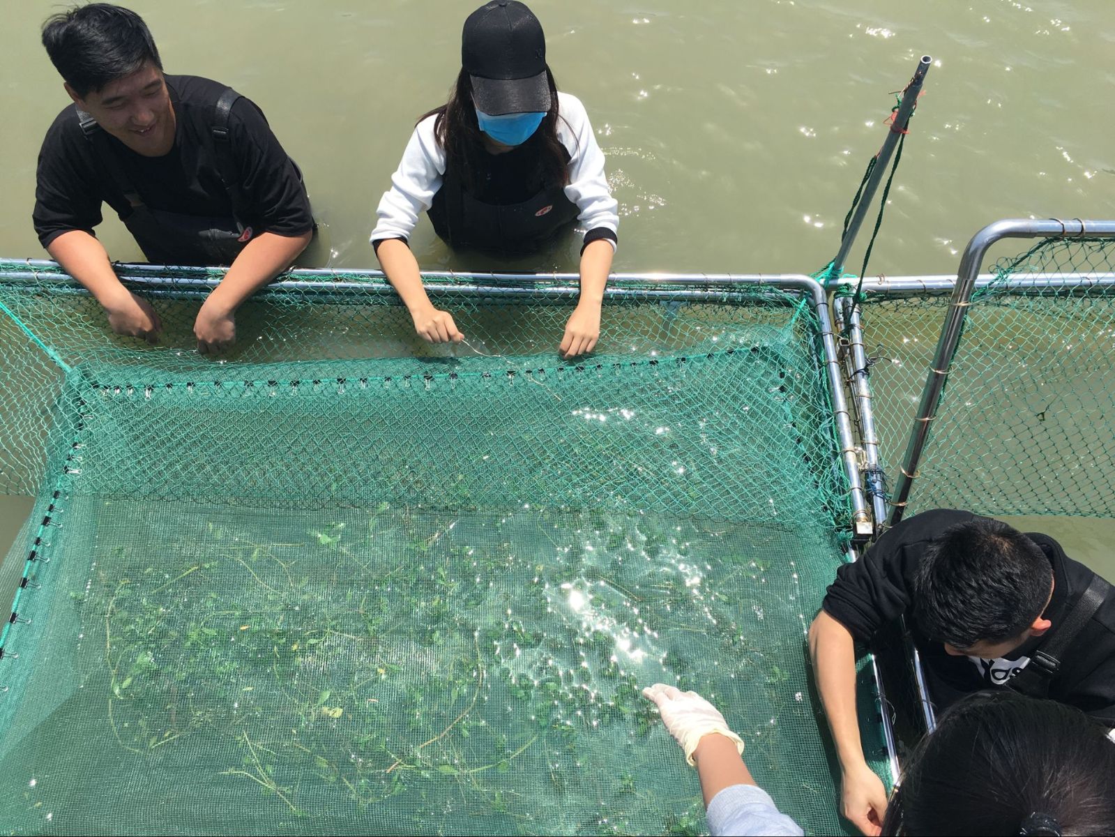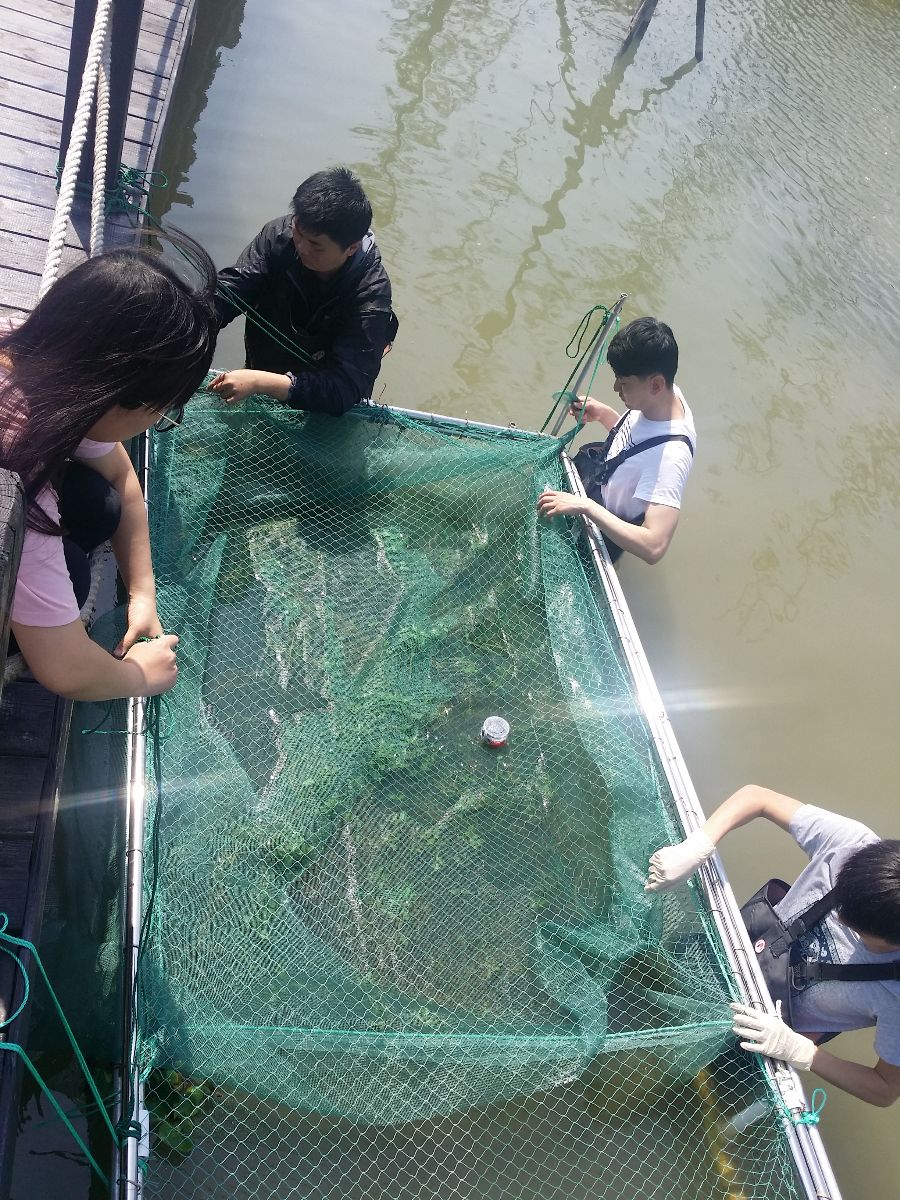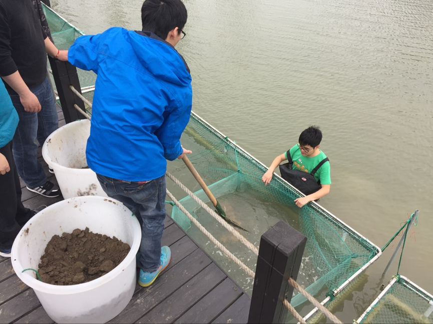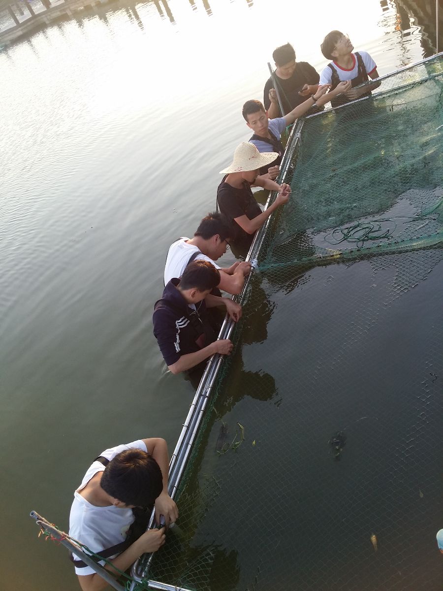 5月17日,近几日连续降雨,基地水位提高,学生们纷纷担忧起自己的小鳝苗,在指导老师的带领下,大家奔赴基地,发现网箱被淹没了不少,大家顾不得先休息,纷纷跳入水中,共同协作提升网箱。