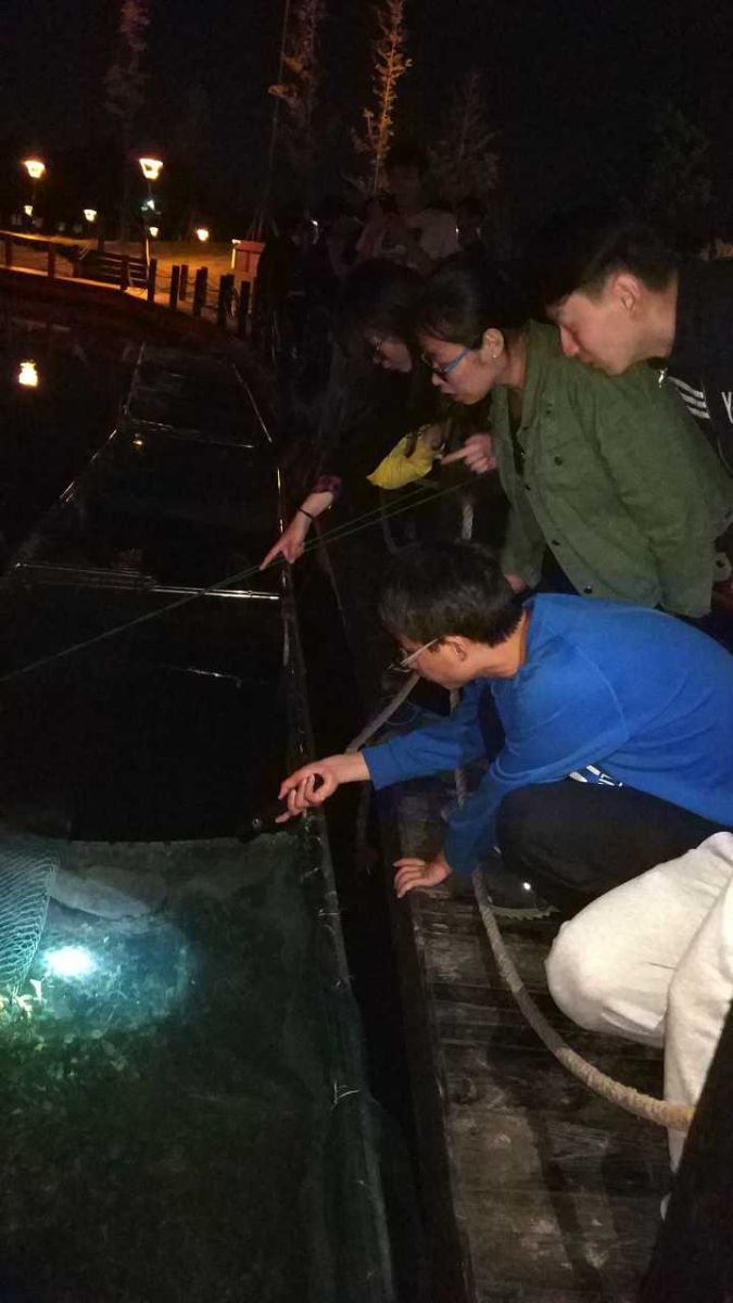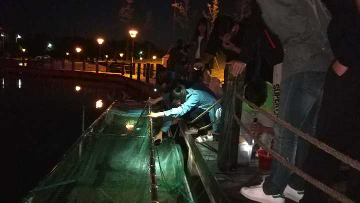 夜幕降临,基地陷入沉寂之时,水产151班的同学们又一次在池塘边集合,观察黄鳝夜晚的摄食情况,当发现自己组网箱中的黄鳝出现时,大家都很兴奋,仿佛看到自己精心培育的果实。观察时也发现几个组网箱中植物过少,大家协商决定明日再去采集补充一些水生植物。