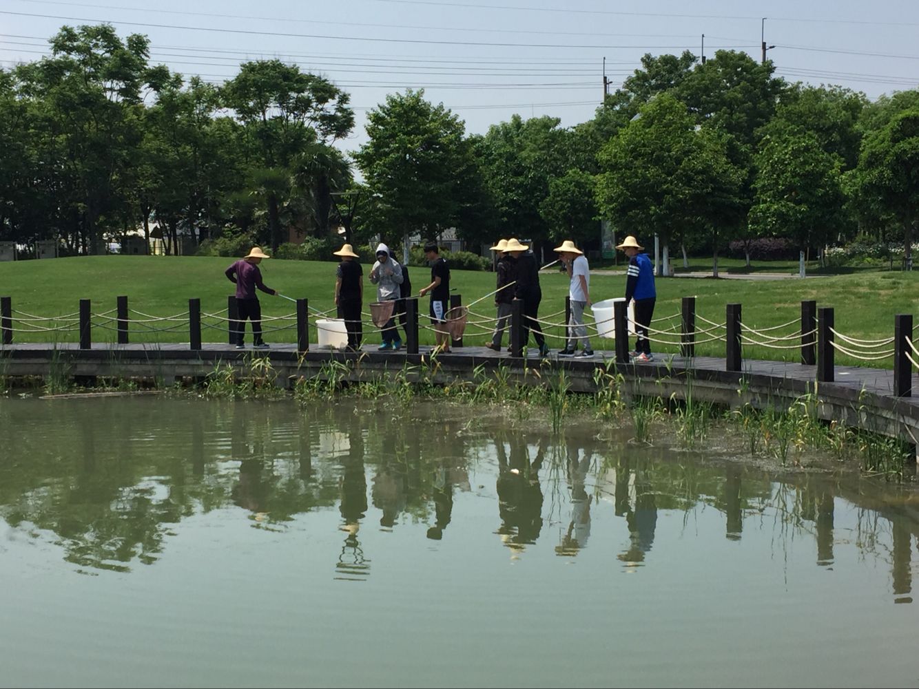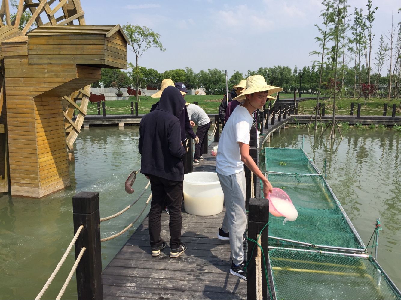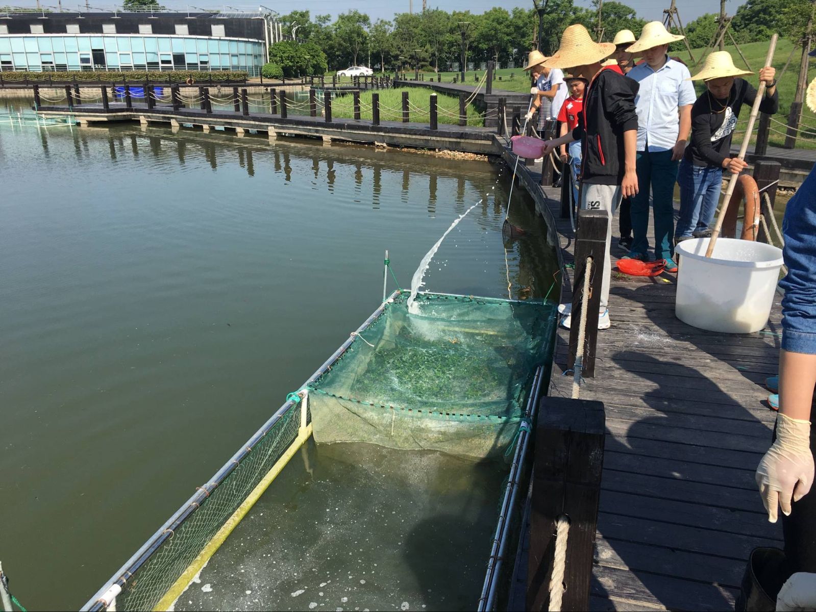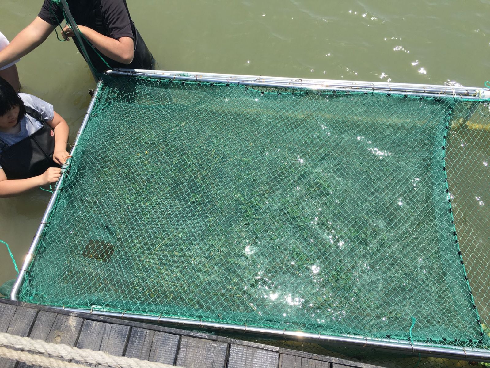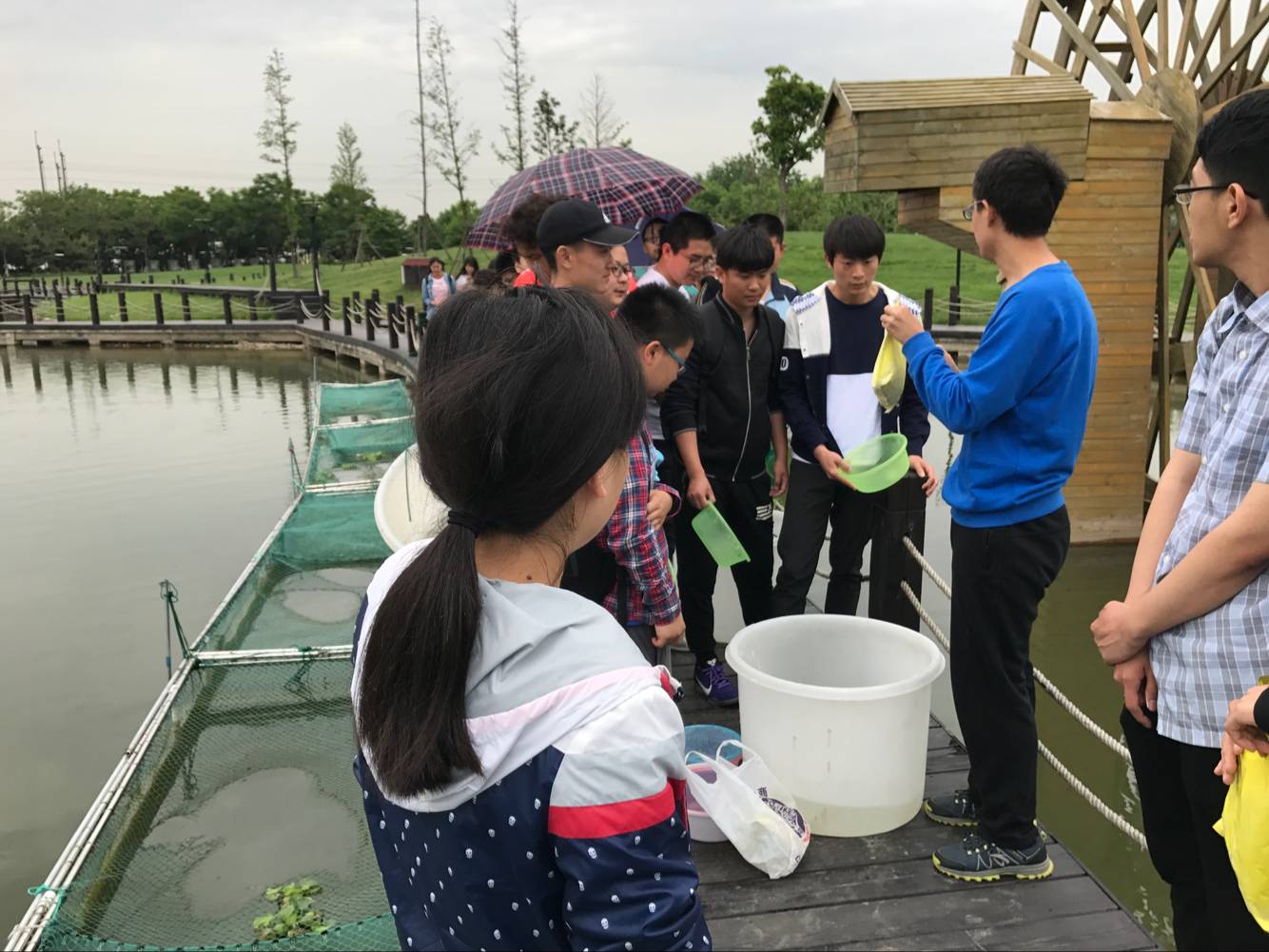 一周以后,为防止黄鳝外逃,同学们自己动手,为网箱定做了网盖。将网盖固定在网箱上以后,新的问题出现了,如果将网箱四周全部固定网盖,黄鳝不会外逃,但影响了平时的喂食与管理;如果留一个缝隙用于投喂,黄鳝善于溜边与钻行,容易大量逃走。这时老师与同学们在池塘边都陷入了沉思,一场头脑风暴正在进行。我们在池塘边的讨论引起了基地工作人员的注意,基地的老师傅们也参与进来,利用自己的丰富经验与我们一起研究起来防逃措施来。