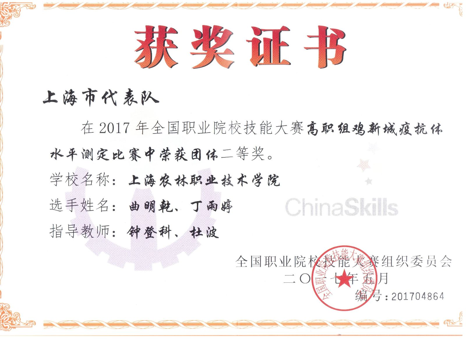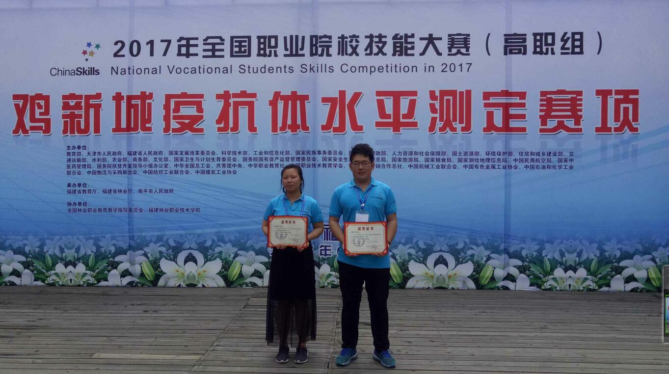 6月4日,2017年全国职业技能大赛(高职组)“鸡新城疫抗体水平测定”赛项,在福建林业职业技术学院开赛。我院动物科学技术系动医151班丁雨婷和曲明乾2名同学代表上海市,与来自全国各省市73所高职院校的参赛选手同台竞技,最终荣获比赛团体二等奖。