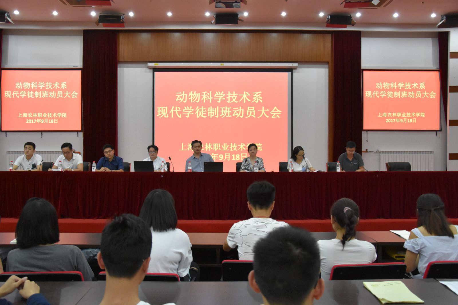 9月18日,在综合楼205报告厅,动物科学技术系召开现代学徒制“顽皮宠物”试点班宣传动员大会。上海顽皮家族宠物有限公司副院长林毓暐、董事长特别助理游程皓,校企合作办主任宋常英,动科系主任郑江平,动科系书记杜波,3名在上海顽皮家族宠物有限公司工作的校友以及2016级、2017级(贯)动物医学140余名学生参加动员会。会议由动科系书记杜波主持。