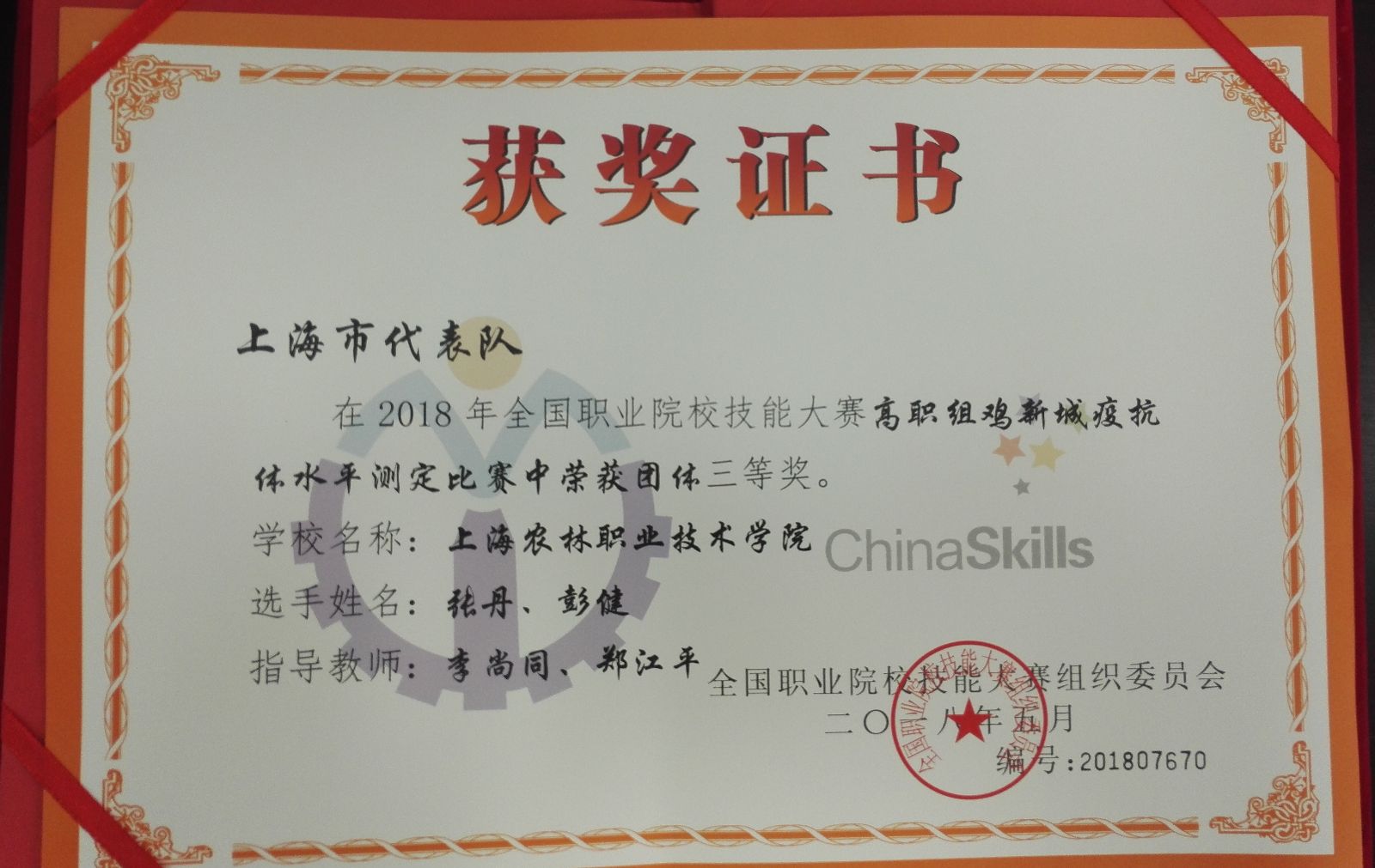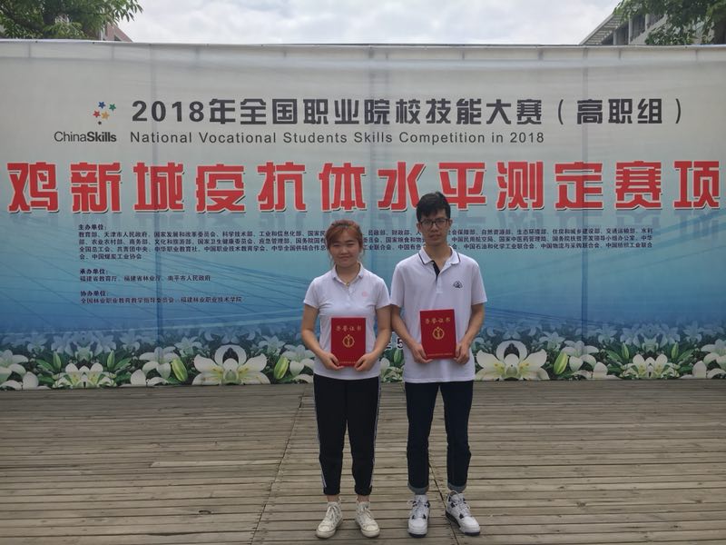 5月26日至5月28日,2018年全国职业院校技能大赛(高职组)“鸡新城疫抗体水平测定”赛项,在福建林业职业技术学院开赛。我院动物科学技术系动医163班张丹和动医164班彭健2名同学代表上海市,与来自全国各省市68所高职院校的参赛选手同台竞技,最终荣获团体三等奖。