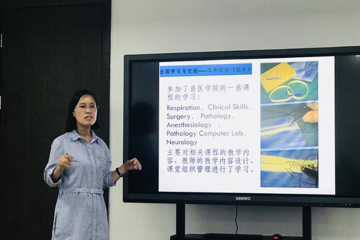 会上,尚月丽老师向大家分享了她在教学和科研上的访学收获,并对今后工作的做了相关展望。首先,介绍了美国佛罗里达大学及其兽医学院的基本情况。其次,对教学和科研项目的学习内容做了详细讲解。在教学方面,主要学习了相关课程的教学内容、教师的教学内容设计、课堂组织管理等,通过了存活手术操作考试,掌握了小鼠卵巢摘除手术无菌操作的全过程,深入了解了动物的护理理念。在科研方面,出色地完成了多项科研任务,包括:建立了哺乳动物肝组织线粒体实时定量活性检测技术(Seahorse high technique);完成3个不同组野生型鼠全部雌激素受体敲除,及雌激素膜受体敲除鼠的肝脏组织线粒体活性检测;完成了3个组鼠肝脏线粒体活性8个相关基因的Real-time 检测及结果分析。尚老师还介绍了她在实验室使用的一些仪器和作用。最后,尚月丽老师介绍了自己的工作设想,在教学上,以北美职业兽医考试教材作为标准,参考美国兽医学院4年的培养方案、课表和相关的教材,改革《实验室检查》授课内容,会严格要求学生,培养其吃苦耐劳、积极努力学习的精神和动物福利的意识;在科研上,建立对外营业的宠物病理诊断实验室,规范兽医行业学生的操作方法与理念。