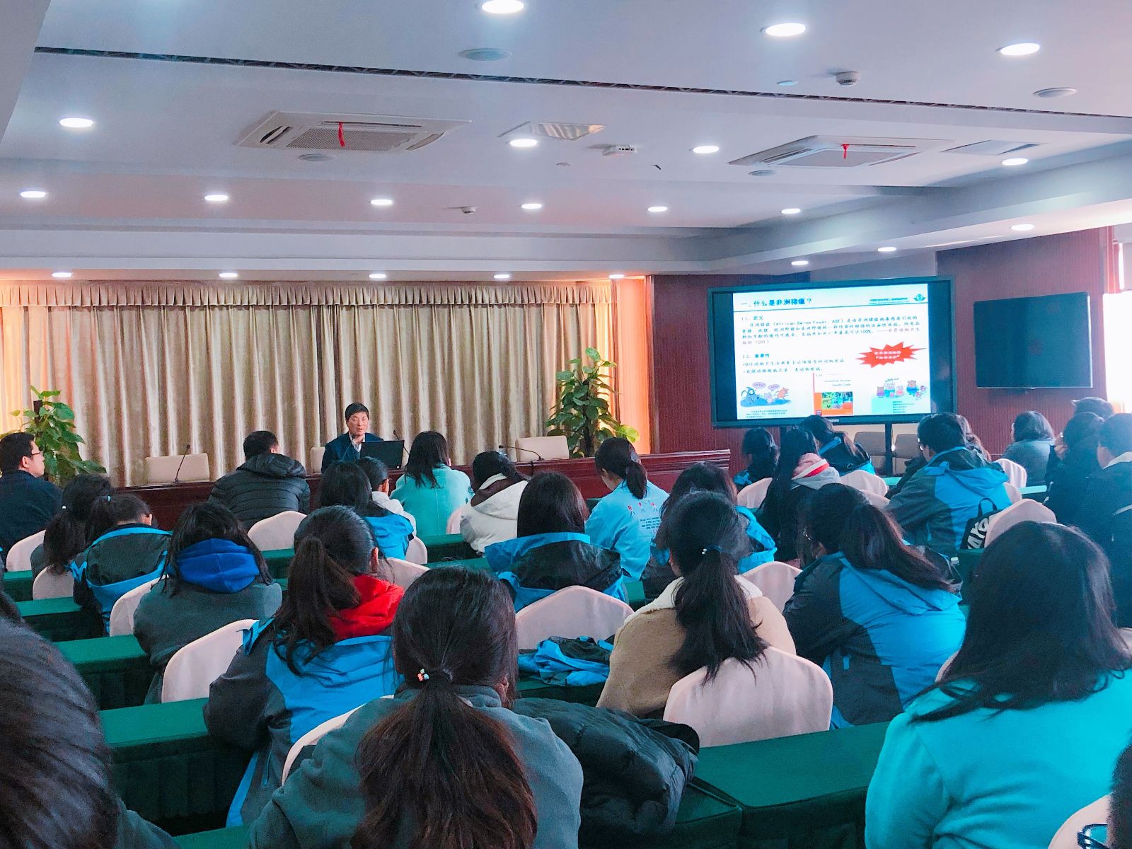 魏博士首先围绕“什么是非洲猪瘟”、“非洲猪瘟病毒是如何传播的”、“非洲猪瘟都有哪些危害”、“非洲猪瘟对人的健康有无危害”及“如何防控非洲猪瘟”等5个方面为现场师生详细介绍了非洲猪瘟的定义、病原及其特征、流行病学特点、历史与分布、目前国内非洲猪瘟疫情动态及目前的防控技术等内容。随后,魏博士就社会上普遍关心的食品安全方面的问题作了解答。他表示,非洲猪瘟病毒的历史已经超百年,迄今为止,并没有非洲猪瘟感染人或人因此致病的报道,故只要购买具备检疫证明的猪肉,都可以放心食用。针对非洲猪瘟病毒基因型多、数量庞大等因素,目前国内外均没有有效的疫苗问题,魏博士最后结合其所在科研团队的研究经历和情况介绍,勉励我系学生认真学好专业知识,不断丰富自己的知识结构,提高综合素质和能力,为我国三农事业的发展贡献力量。本次讲座持续近一个半小时,魏博士结合自身多年的科研和工作经验,通过深入浅出的讲解解开了大家心中的困惑,感觉受益良多。