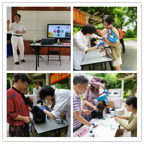 讲座结束后,居民们带着自己的宠物来到社区中心花园,我校宠物医院的沈丽、金淑雯为社区养宠居民提供体外驱虫、免费义诊、疫苗注射等服务。对于居民提出如如何办理狗证、疫苗多长时间注射一次等问题老师们都耐心、细致的一一解答。不少居民抱着宠物前来体外驱虫、注射疫苗和问诊,老师们一一为他们服务,保定、注射、看诊各项服务专业、细致、暖心。