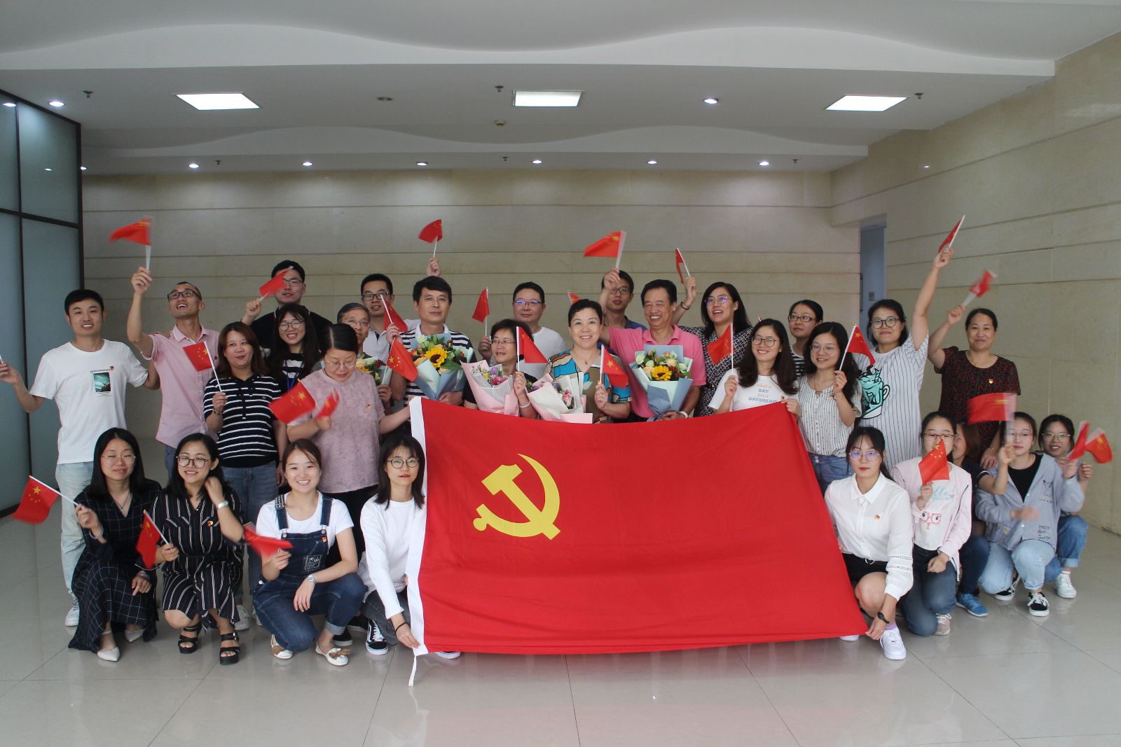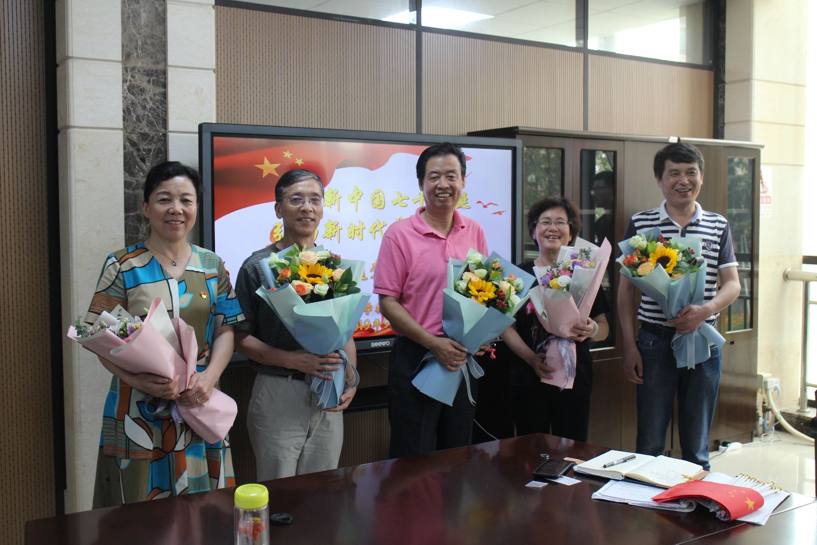 张海娜代表党支部祝新中国七十周年生日快乐,感谢系部老师对支部工作的支持和帮助,承诺将义不容辞担当起党赋予的职责和使命,不忘初心,砥砺前行。她和学生代表,青年教师代表一起向老教师献花,感谢他们的付出。
