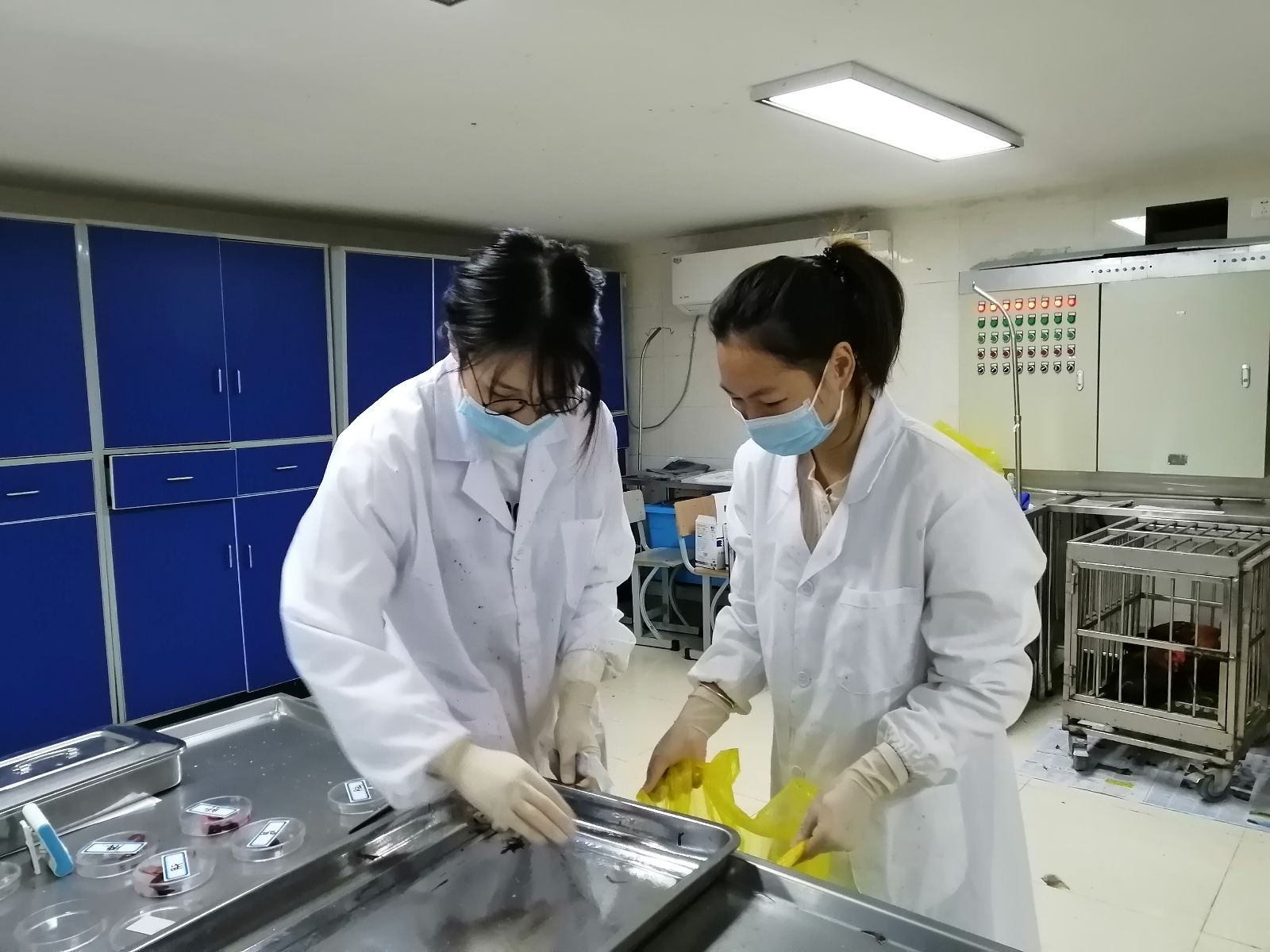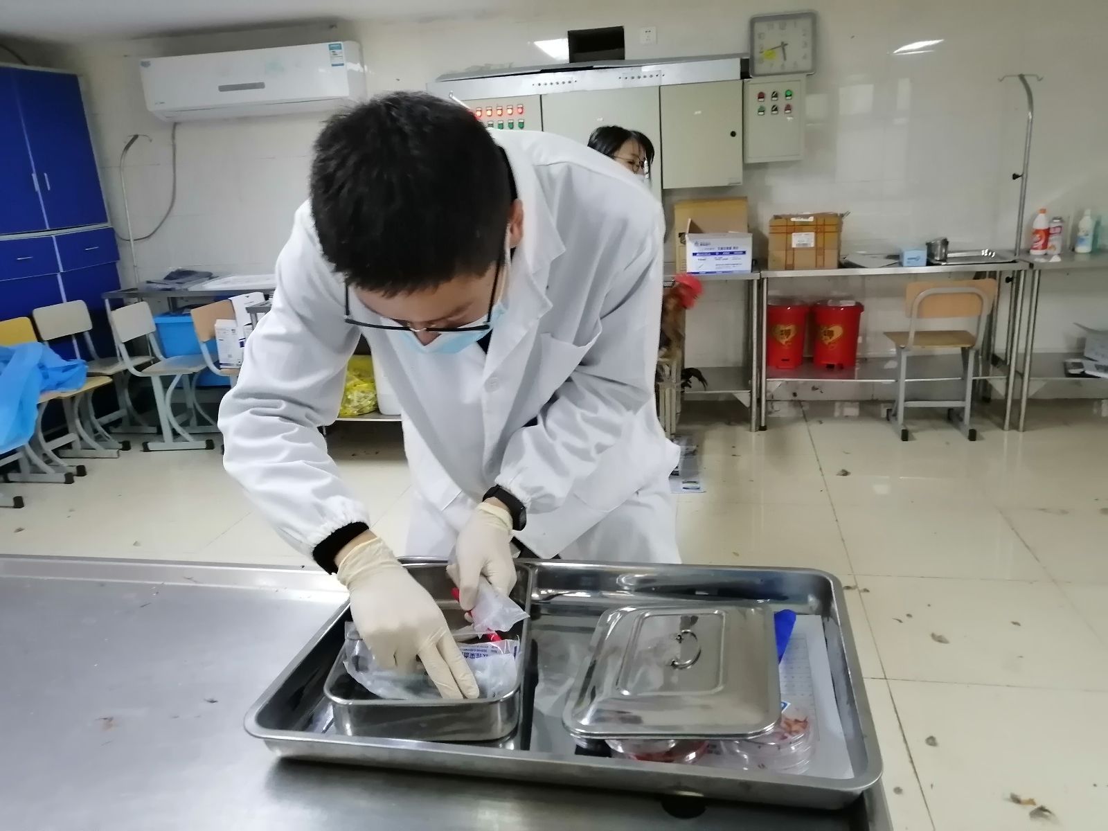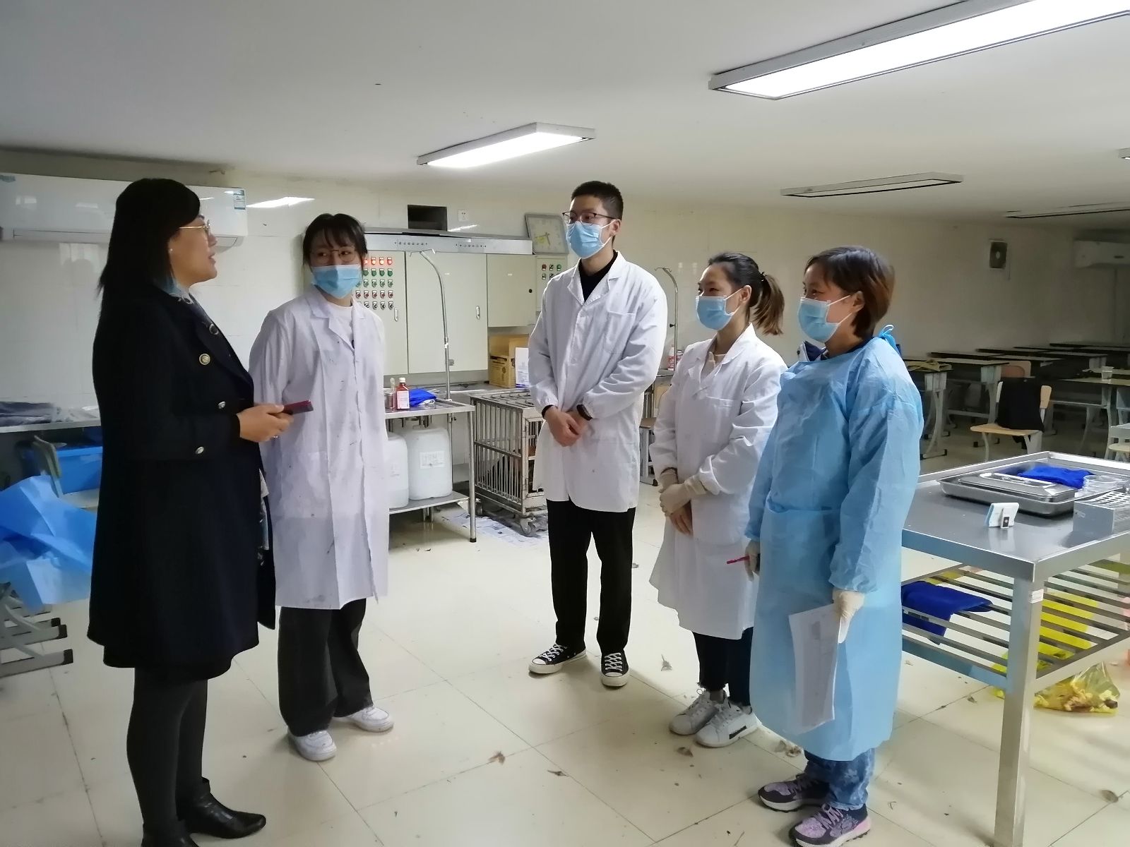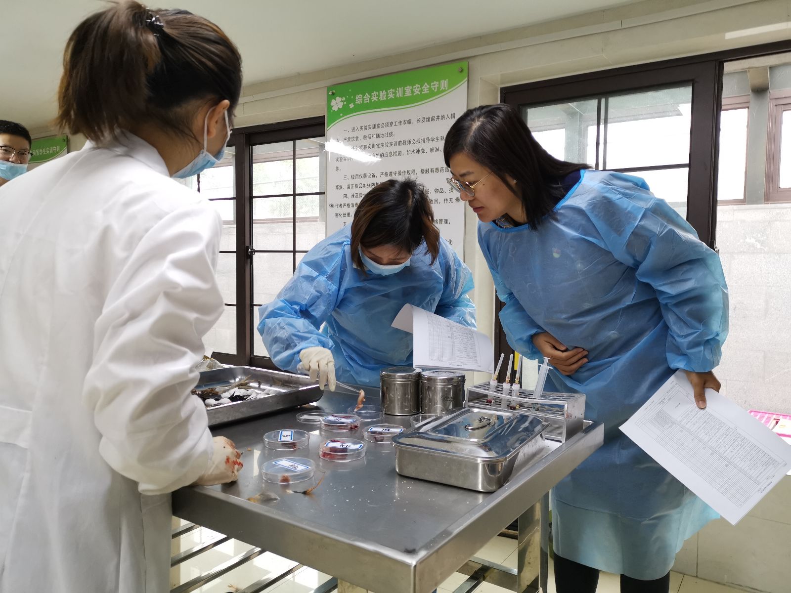 11月18日上午,动科系备战2019年全国大学生动物防疫职业技能大赛的选手和指导老师在清水平台实验室进行训练,动科系党支部书记张海娜、辅导员前往参观并对学生进行指导。