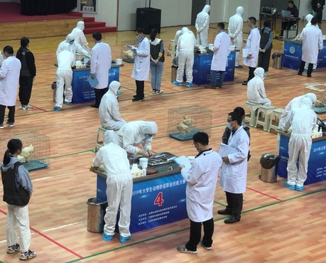 此次比赛需要记忆大量的理论知识,还要在总计17分钟内完成鸡翅静脉采血、鸡心脏采血和鸡体解剖与采样三部分内容的现场操作。从上学期开始,动科系即进行了理论考试和技能考核的层层选拔,最后确定了理论扎实,技能出众的3名参赛队员,本学期开学后,立即投入到紧张的训练中。学院、系部高度重视,多次开会讨论训练方案及克服实验室场地紧张、活鸡难买等困难,为比赛选手提供了最充分的训练保障。参赛师生不辞辛苦,放弃周六、日休息时间、国庆假期,加班加点,积极备赛。