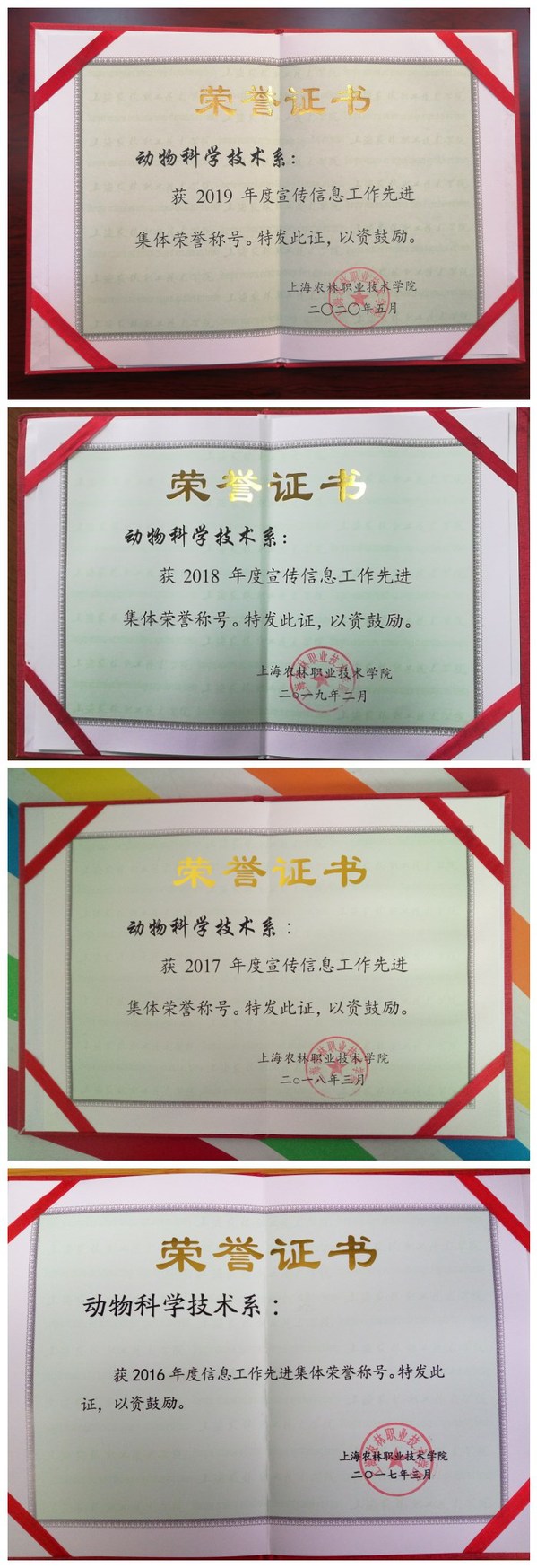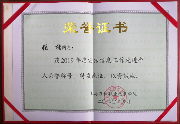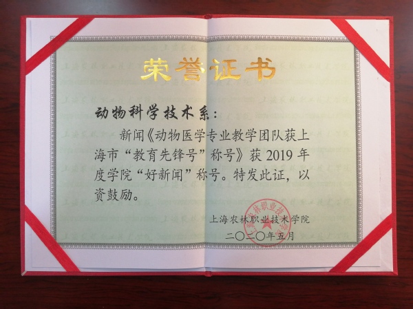 为总结经验、表彰先进,经过部门申报、信息工作领导小组评议、学院审批等程序,动物科学技术系荣获2019年度宣传信息工作先进集体荣誉称号,战晓燕撰写的新闻《动物医学专业教学团队获上海市“教育先锋号”称号》获2019年度学院“好新闻”称号,张楠获2019年度宣传信息工作先进个人荣誉称号。这也是动科系继2016年、2017年、2018年后,再次获得宣传信息工作先进集体。