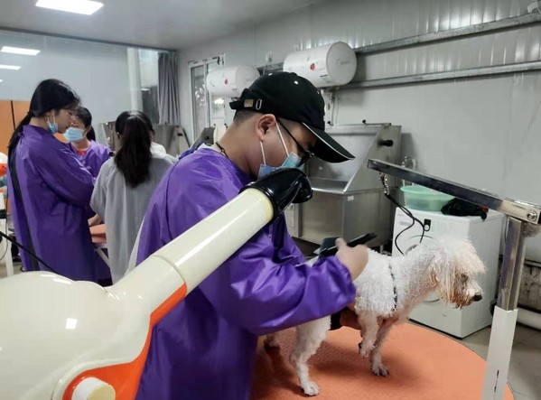 考核分为理论考核(40%)和实操考核(60%)两部分,理论考核以机考形式进行,实操考核分假毛修剪(干区)和犬只洗护(湿区)两部分内容。60名学生分为三组,干区和湿区交错进行,在考评员严格考评下,历时近6个小时,此次考核圆满结束。