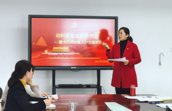 4月9日下午,动科系党总支在807会议室组织开展学“党史”暨“结对帮扶暖人心“主题党日活动。活动由动科系党总支副书记张海娜主持,动科系全体党员教师和23名学生参加。