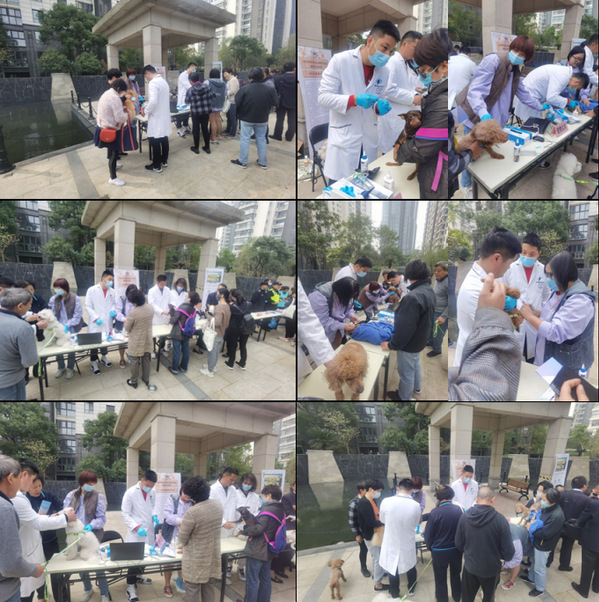 为持续深入推进党史学习教育,贯彻落实“我为群众办实事”,10月22日上午,动科系教学动物医院联合上海市农业执法大队,上海市松江区公安治安管理大队养犬办,松江区农业执法大队等部门,由动物医院负责人沈丽老师带队,带领党员志愿者在东鼎社区开展宠物义诊活动。