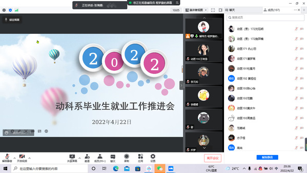 4月22日晚,动科系通过视频会议方式召开2022届毕业生就业工作推进会。动科系党总支副书记张海娜参加会议并讲话,毕业班辅导员程梦勤主持会议。