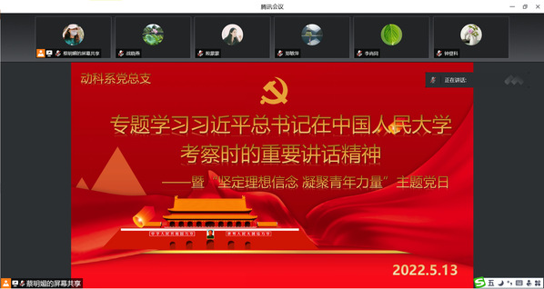 5月13日,动科系党总支开展线上专题学习主题党日活动,学习习近平总书记在中国人民大学考察时的重要讲话精神,进一步统一思想,提高认识。专题学习会议由动科系党总支副书记张海娜主持,全体党员参加学习交流。