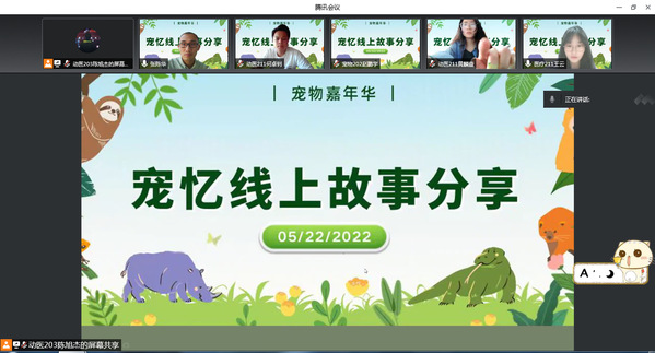 为锻炼和提升宠物摄影的专业实践能力和口语表达能力,培养同学们热爱自然,关爱生命的情怀和职业素养,同时进一步呼吁大家珍爱生命、文明养宠。5月22日,第八届宠物嘉年华之“宠忆”摄影及故事征集分享会在线上举行,经过初评,遴选出15名同学摄影及故事作品进入线上展示和分享环节,动科系党总支副书记张海娜、各年级辅导员、团学骨干和各班同学代表共40余人参与了本次活动并作为评委对活动进行投票。
