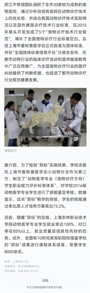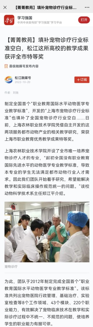 10月20日,学习强国平台报道了学院凭借自主开发的“职业教育国际水平动物医学专业教学标准”和“上海市宠物诊疗行业标准”这两项服务都市动物产业的相关教学研究,荣获上海市职业教育优秀教学成果特等奖。