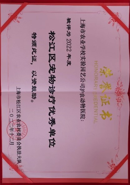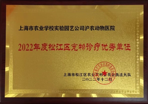 上海市农业学校实验园艺公司沪农动物医院和另外三家宠物诊疗机构在松江区全区46家宠物诊疗机构当中脱颖而出,成功当选“2022年度松江区宠物诊疗优秀单位”。