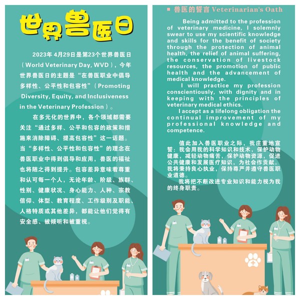 2023年4月29日是第23个世界兽医日(World Veterinary Day, WVD),今年世界兽医日的主题是“在兽医职业中倡导多样性、公平性和包容性”(Promoting Diversity, Equity, and Inclusiveness in the Veterinary Profession)。