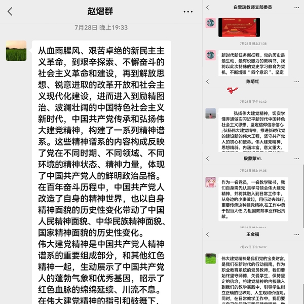 座谈会上,三位党员教师代表立足工作岗位,围绕伟大建党精神,结合主题教育学习心得展开交流讨论。发言代表们从“中国共产党”命名的由来讲起,详细阐明中国共产党从一开始就把马克思主义写在自己的旗帜上,把实现共产主义作为最高理想和最终目标,把实现中华民族伟大复兴的民族国家历史使命,同共产主义的世界历史远大使命有机统一起来。百年岁月流逝,一段段不容忘却的革命历史更加详细记录着中国共产党人的初心和使命,处处闪耀着伟大建党精神和革命优良传统的光芒。“坚持真理、坚守理想,践行初心、担当使命,不怕牺牲、英勇斗争,对党忠诚、不负人民”这32个字是对伟大建党精神的高度、精准概括,是中国共产党的精神之源。他们表示作为青年老师,要坚持理论联系实际,把所学的理论与实际教学相结合,不断提高自身综合素质,提高教育理论水平和业务能力;要着力推进体系创新,借鉴先进经验,努力建设高水平、高层次的技术技能人才培养体系,面向实践、强化能力,让更多青年凭借一技之长实现人生价值;要着力推进途径创新,推进产教融合、校企合作,推动形成产教良性互动、校企优势互补的发展格局,吸引更多青年接受职业技能教育;要加强自身建设,优化完善教材和教学方式,探索中国特色学徒制,营造人人努力成才、人人皆可成才、人人尽展其才的良好环境。