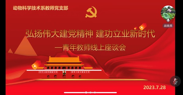 在中国共产党成立102周年之际,为深入学习贯彻习近平新时代中国特色社会主义思想主题教育,进一步强化党员身份意识、宗旨意识、责任意识,7月28日晚,动科系教师党支部开展“弘扬伟大建党精神 建功立业新时代” 主题党日活动暨青年教师线上座谈会,教师支部全体党员参加。活动由教师党支部书记战晓燕主持。