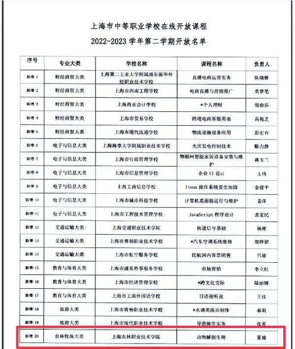 根据上海市中职在线开放课程验收及开放办法,动科系夏灿老师主讲的《动物解剖生理》于2023年上半年通过验收,现已在市级在线开放课程平台发布(网址:https://kfkc.shedu.net/)。