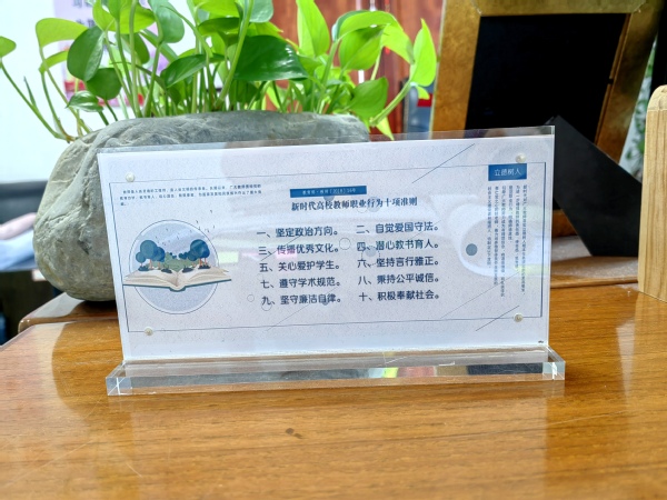 会后,向全体教职工发放《新时代高校教师职业行为十项准则》桌牌,激励全体教职工自省吾身,常思己过,善修其身,牢记立德树人使命,为社会培养更多高质量职业技能人才。