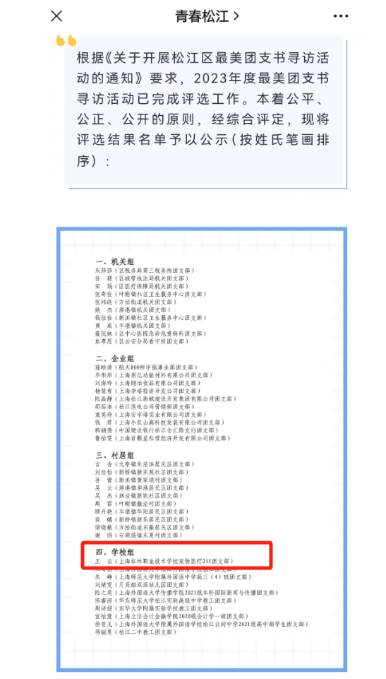 近日,共青团上海市松江区松江委员会公布了松江区2023年度最美团支书寻访结果。动科系医疗211班王云同学荣获“2023年度松江区最美团支书”荣誉称号。