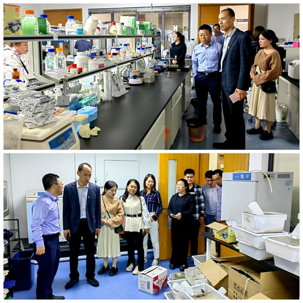一行人在杨志彪的带领下,前往农学院实验楼进行参观。通过介绍,学习了解到了实验室的运行和管理机制、研究内容以及当前已取得的科技成果等。