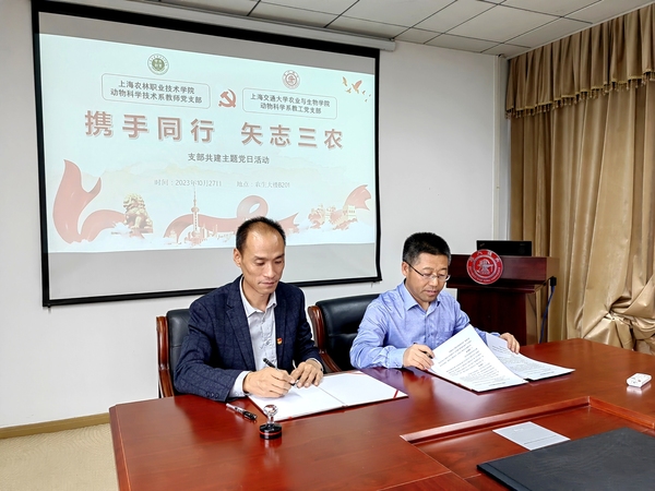 为持续巩固主题教育成果,探索党建赋能业务新路径,10月27日,动科系教师党支部与上海交通大学农学院动科系教工党支部在上海交通大学闵行校区农学院B201会议室举行“党建共建”签约启动仪式暨“携手同行 矢志三农”共建主题党日活动。动科系教师党支部书记、动科系主任滑志民,上海交大农学院动科系主任袁聪俐,上海交大农学院动科系教工党支部书记杨志彪以及双方支部党员代表、入党积极分子参加活动。