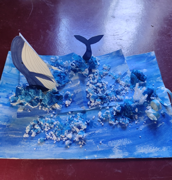 作品介绍:围绕环保的主题,用卫生纸、泡沫板、一次性吸管和素描纸等一系列环保材料,设计了鲸鱼出海的画面,向往着自由与美好,预示着干净蔚蓝的大海反对核污水和核废水的排放,呼吁同学们爱护环境,保护自然。心中怀揣一个艺术梦,在这个梦里,天可以更蓝,水可以更清,我们都有一个环保梦,身边的一切都可以重新利用。环保不止于一个口号,是真真切切的行为和生活习惯,爱护自然,保护自然,是我们每个人的责任。
