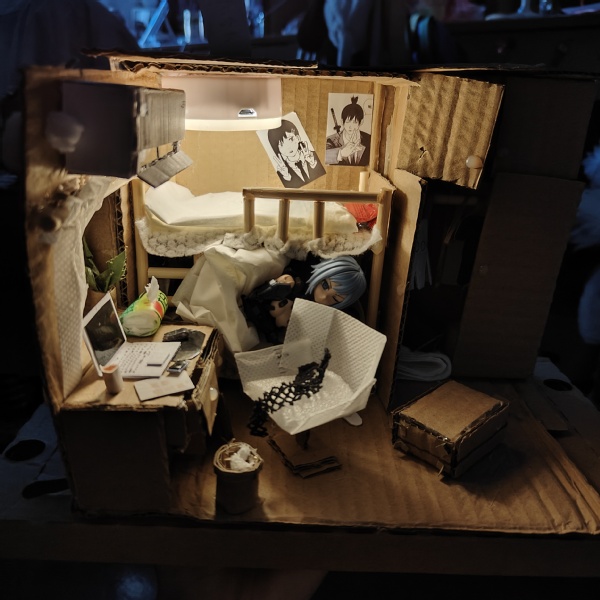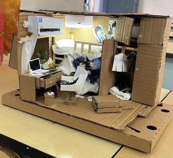 作品介绍:“18岁的美女小狐是我的房客,我们相处融洽,她总是喜欢躺床上看着我玩游戏,我们互相关心,无话不谈”。其实这一切只是一场梦,没有房客,她只是我的幻想,美好的幻想。我开始思考为什么会有这样的梦,也许是因为内心深处有些伤痛需要借此释放,于是我决定努力去面对现实,梦是一种心灵的寄托,而真正的生活需要我亲手去创造,让幻想成为现实。谢谢你,我的18岁美女房客!该作品灵感来自于小说《我的26岁美女房客》中对人物的美好憧憬,利用同学废弃的快递盒、同学送的橘子叶、同学坏的灯、从同学那捡的包装盒为材料,再以学校宿舍为原型加以制作这份《我的18岁美女房客》。