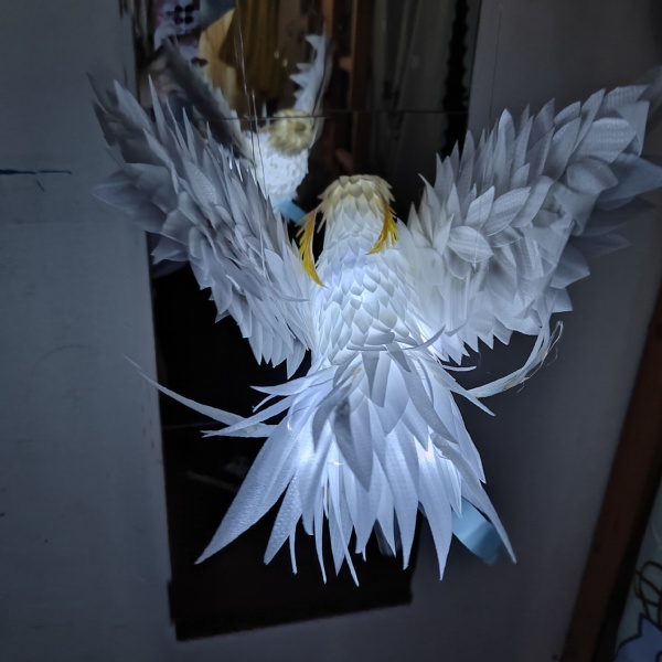 作品介绍:用塑料瓶当作鸟身和鸟头,将泡沫纸剪成羽毛的形状,用热熔胶枪一片一片粘上,粘出尾巴和翅膀的形状,用鱼线吊起翅膀可以做出鸟儿飞翔的感觉,再将小灯串放到瓶子里做出飞鸟灯。给塑料瓶和泡沫纸注入生命,让小鸟灯起飞。