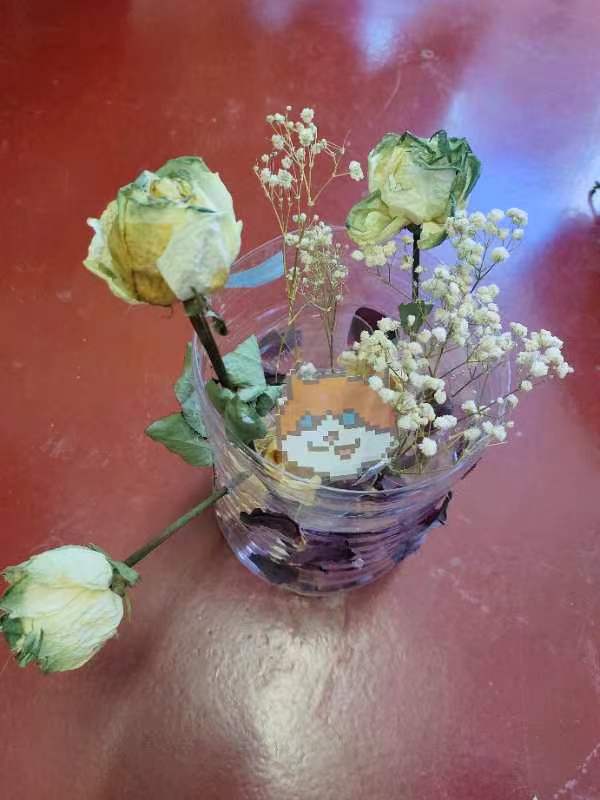 作品介绍:且听风吟,向阳而生。作品由干花花瓣收集而制作,下边铺满红白玫瑰干花瓣,中间镶嵌由塑料瓶制作的环保花,点缀满天星干花花枝,四周有三整支苏格兰绿玫瑰,和红色花瓣。喜欢花但没办法让它一直盛开,想永久留下它晾晒成干花让他一直存在。我想夏天我们讨厌的太阳在冬天变成了喜欢,阴霾和雨天不会一直存在。我们也要积极向上向外,人生其实就是一场修行,每一次经历,每一次体验,每一次感悟,各不相同。起心动念皆是因,当下所受都是果。念头通达,心结全消,向阳而生。
