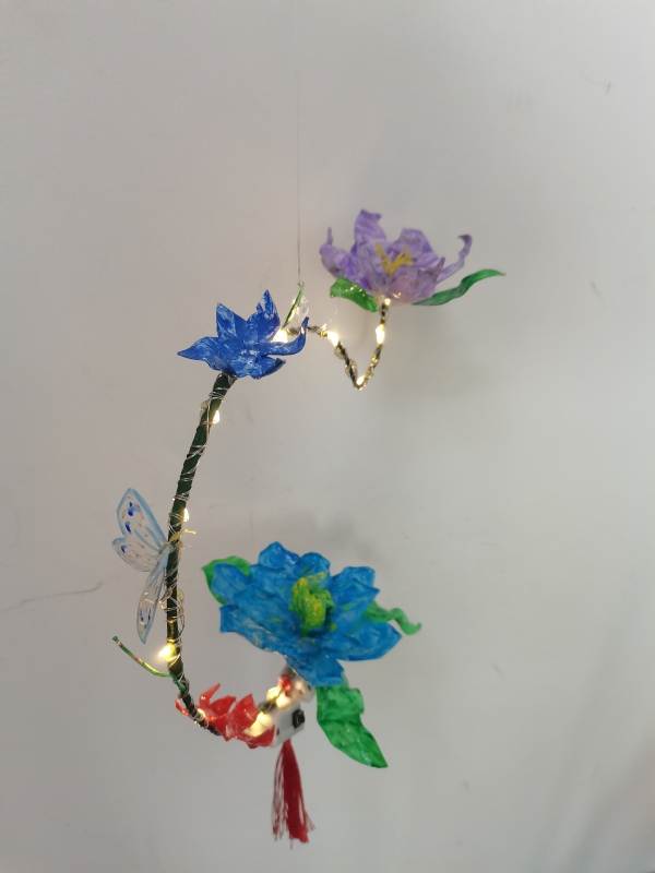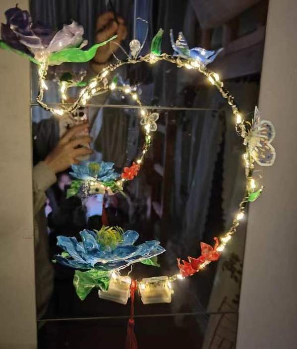 作品介绍:莲花灯倾注着中国劳动人民的朴素情感并以其独特的艺术思维浓厚的生活气息,神奇瑰丽的色彩纯真质朴的艺术境界,焕发出现代传统民俗艺术的独特光彩。这个作品主要是想表达对于塑料瓶子的回收利用,能让大家感受到塑料并不只会污染环境,还能够做出非常有意义的装饰品,也借此呼吁大家一定要保护环境,不要让白色污染越来越严重。
