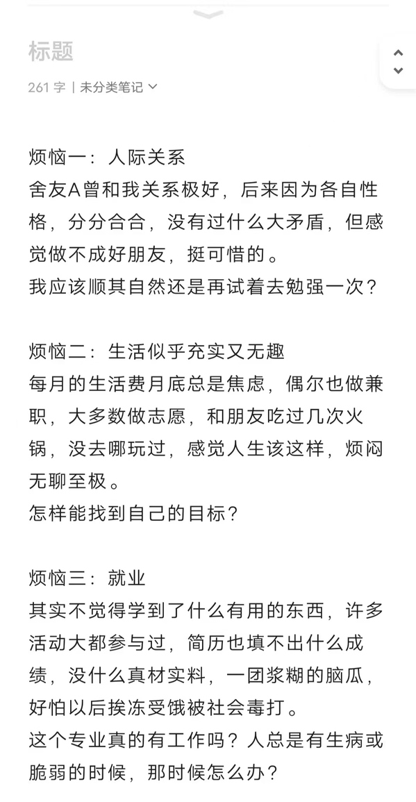 同学们通过这样一个承载万千情感的平台,把埋藏在心底已久的秘密和困惑一一倾诉,或有关生活、友情或有关学习、就业或有关家庭、爱情等等,在这里同学们可以充分享受到说出一切的自由和洒脱。
