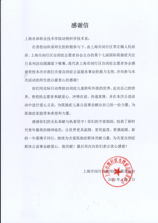 志愿服务后,还收到了上海市闵行区自闭症志愿者协会发来的感谢信。