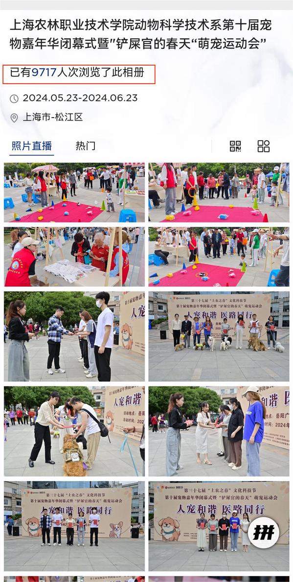 今年的宠物嘉年华,我们以创新之名,重新定义了活动的形式、内容和奖项设置。活动地点从校园走向了社区,与企业携手,共同打造了一场宠物集市,不仅有传统的宠物比赛,还有趣味小游戏、宠物义诊、文明养宠宣传、宠物零食加油站及摊位展示等互动环节,让参与者与萌宠们亲密互动,感情更加深厚。专业文化的奖杯颁发,激励着学生们以敬畏之心、尊兽医之道,精驯养之术,行仁爱之举。活动现场照片直播,实时更新,让线上、线下的观众共同开启萌宠之旅,后台数据显示,现场照片浏览量接近1万人次。