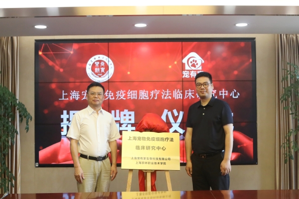 会上,课题负责人滑志民和宠有家公司技术总监应荣博士签订了《PBIC/CIML-NK细胞治疗犬猫乳腺肿瘤/淋巴瘤的临床研究》项目协议,课题经费达75万元,是学院横向课题方面取得的又一次重要突破;蔡红书记与陈辉总经理共同为上海宠物免疫细胞疗法临床研究中心进行揭牌。
