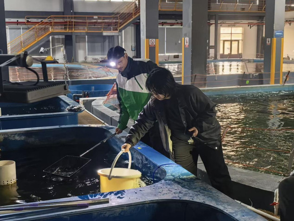在中心基地,感人故事每天都在上演。极端台风天气期间,毕业生们始终坚守一线,彻夜巡查防护、加固设施、保障供氧与水质安全,全力守护中华鲟生命安全,确保基地平稳度险。2024至2025年中华鲟幼苗培育关键期,李海燕等骨干主动睡在育苗池边,实行24小时不间断值守看护,精心照料、细致监测,用坚守与担当守护幼鲟健康成长。
